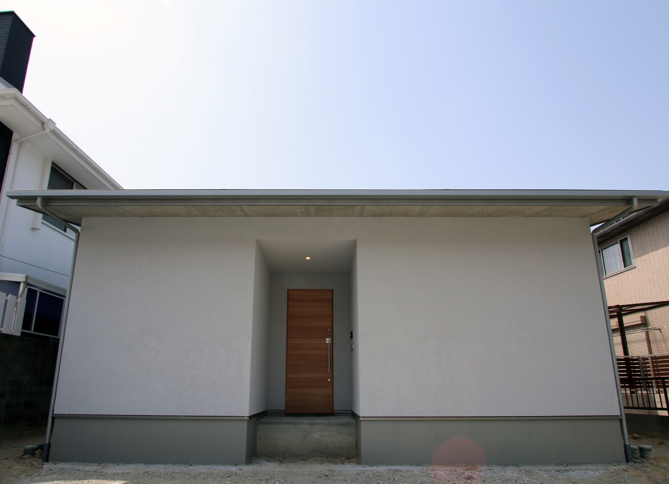 白壁の外壁に外側には窓の少ないスッキリとした家になりました。
