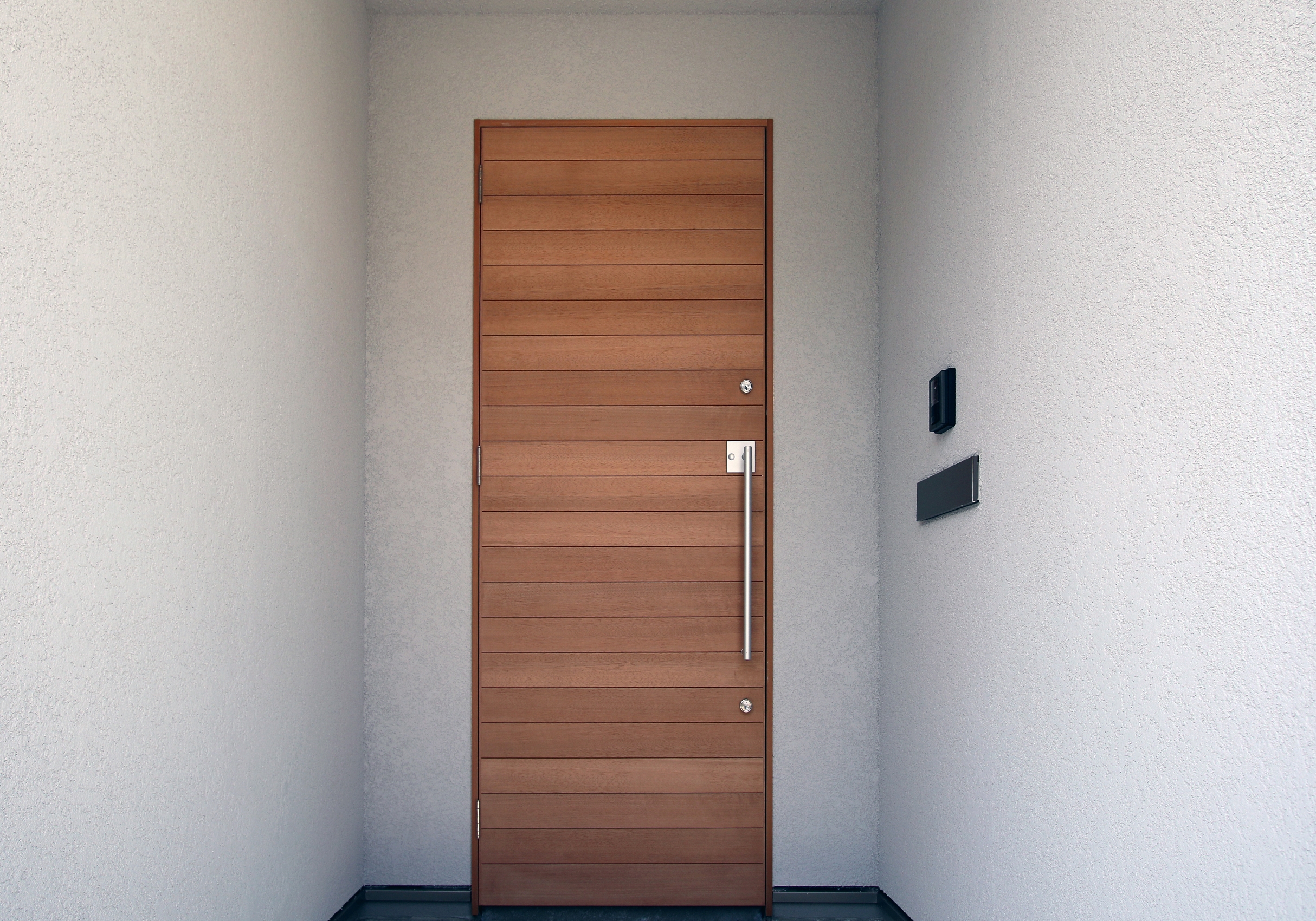 南洋桜で造り上げた玄関ドアと軒天の木毛セメントボードの差し色がアクセントとなり