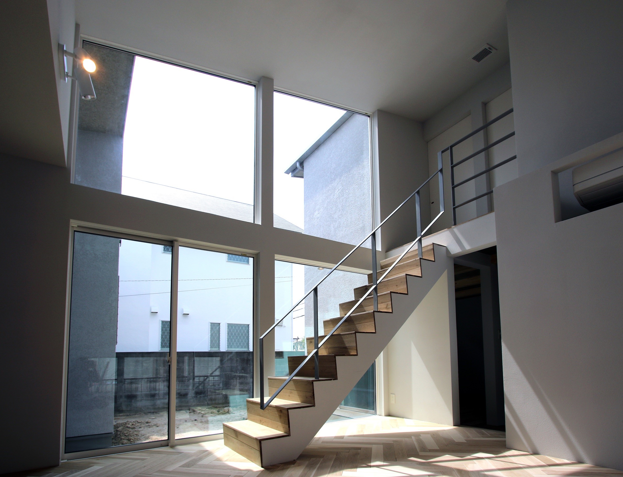リビングの大きな窓の脇に備え付けた階段は美術館のエントランスから上へと誘う