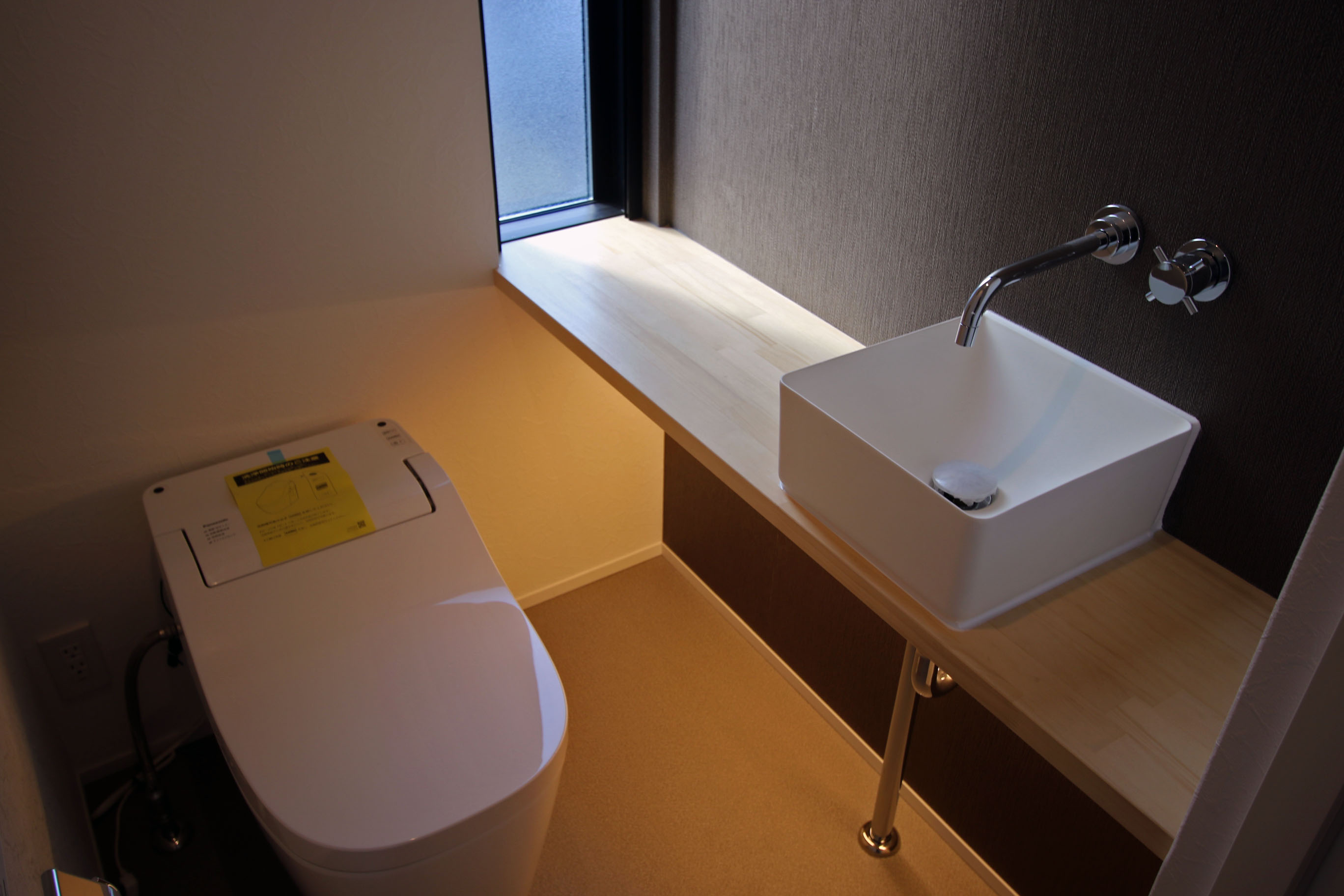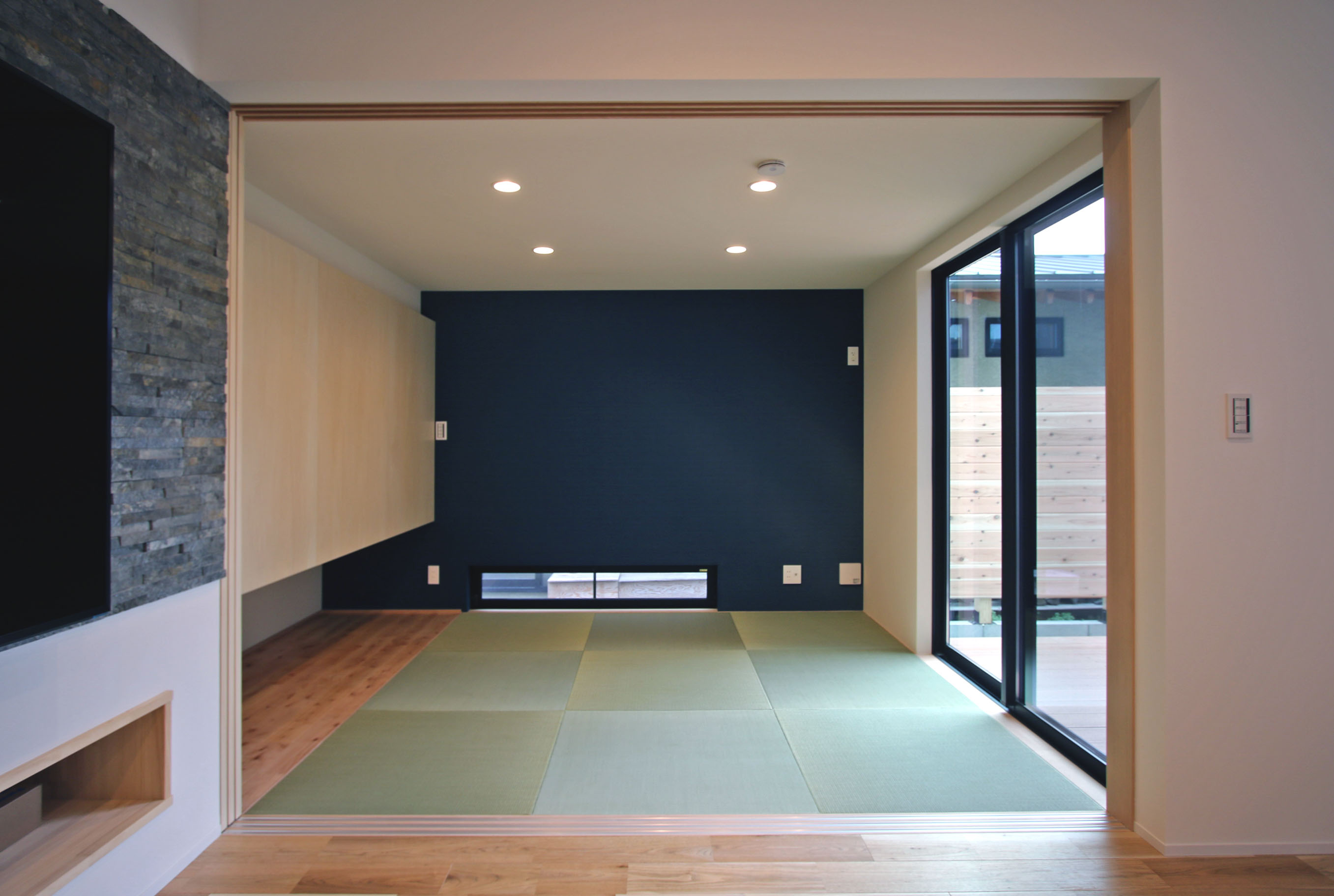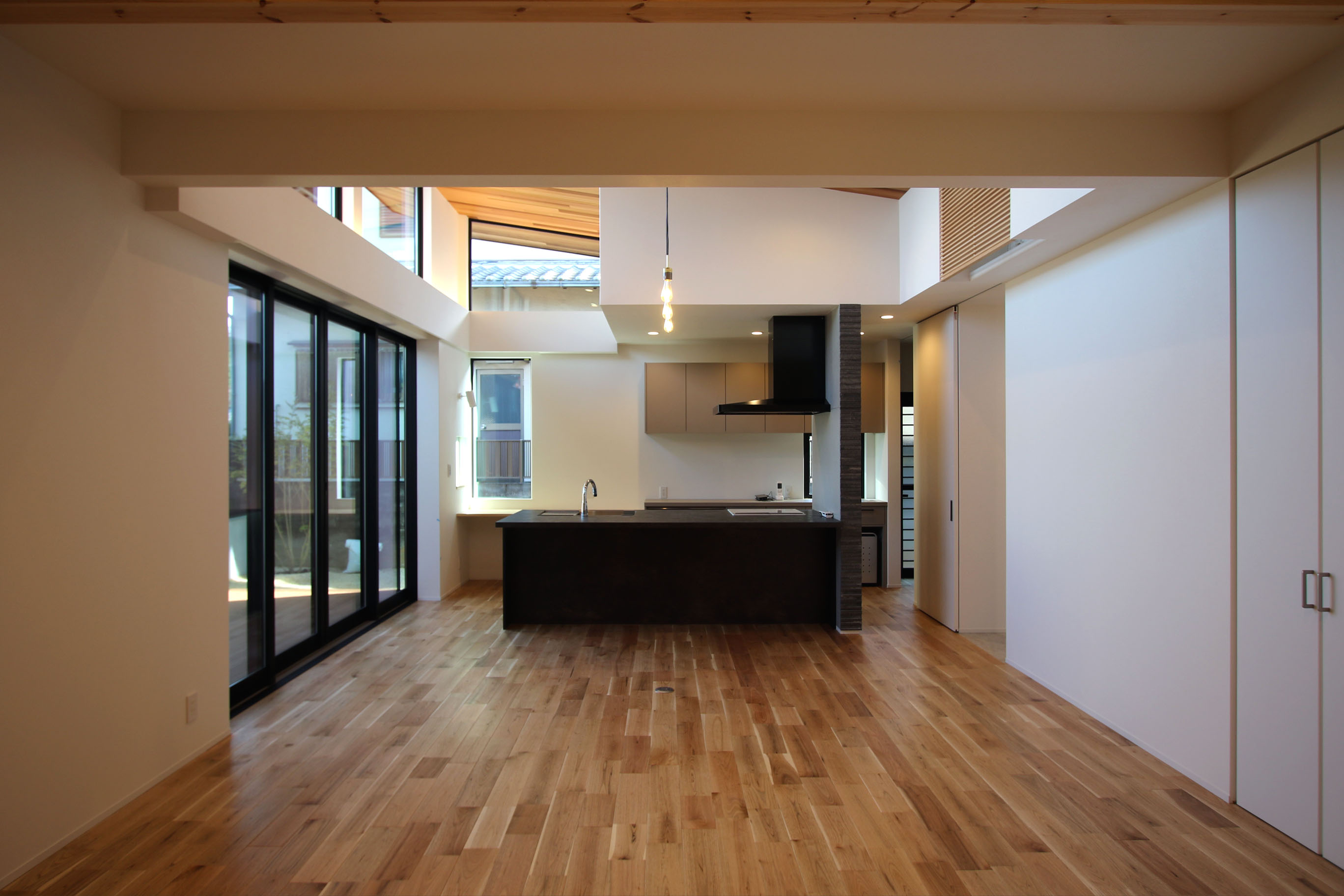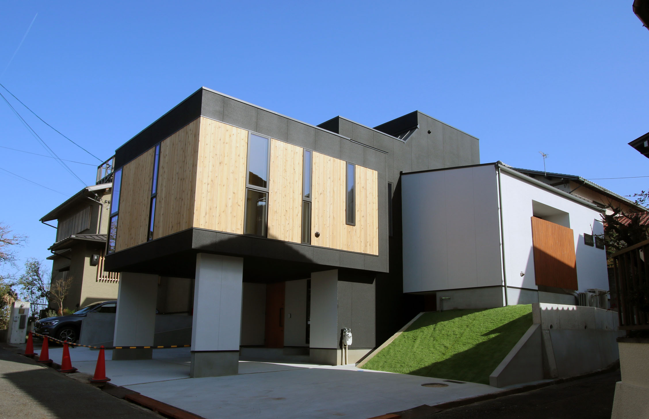 道路から高台になっていた土地を擁壁を撤去し、4台以上の駐車スペースを取るとともに敷地を最大限利用できるように3層目のスペースを大きく持ち出した家です。