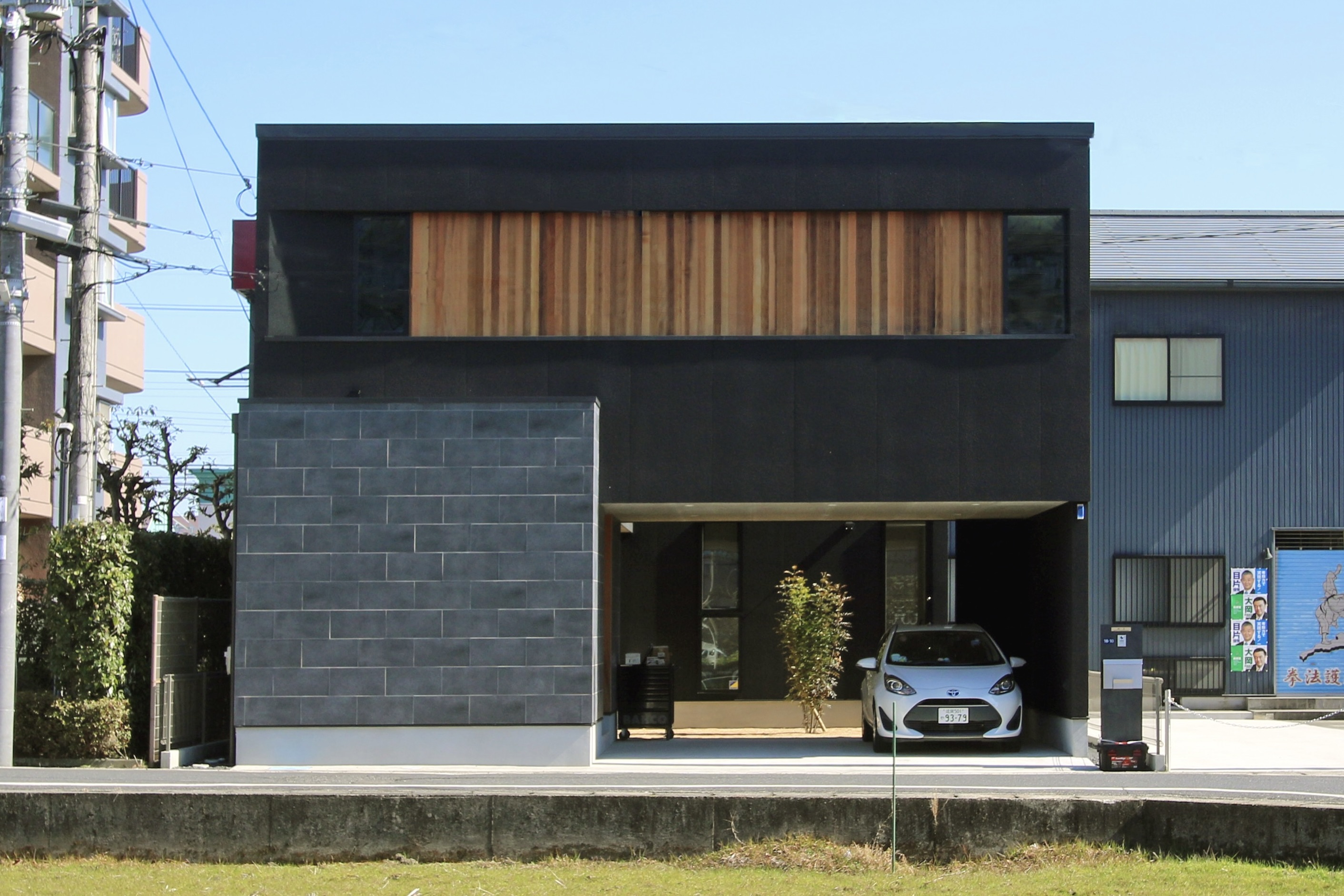黒い外壁にグレーのタイル貼り。そして眼を引くウッドウォールが美しく映えるシックな家がになりました。