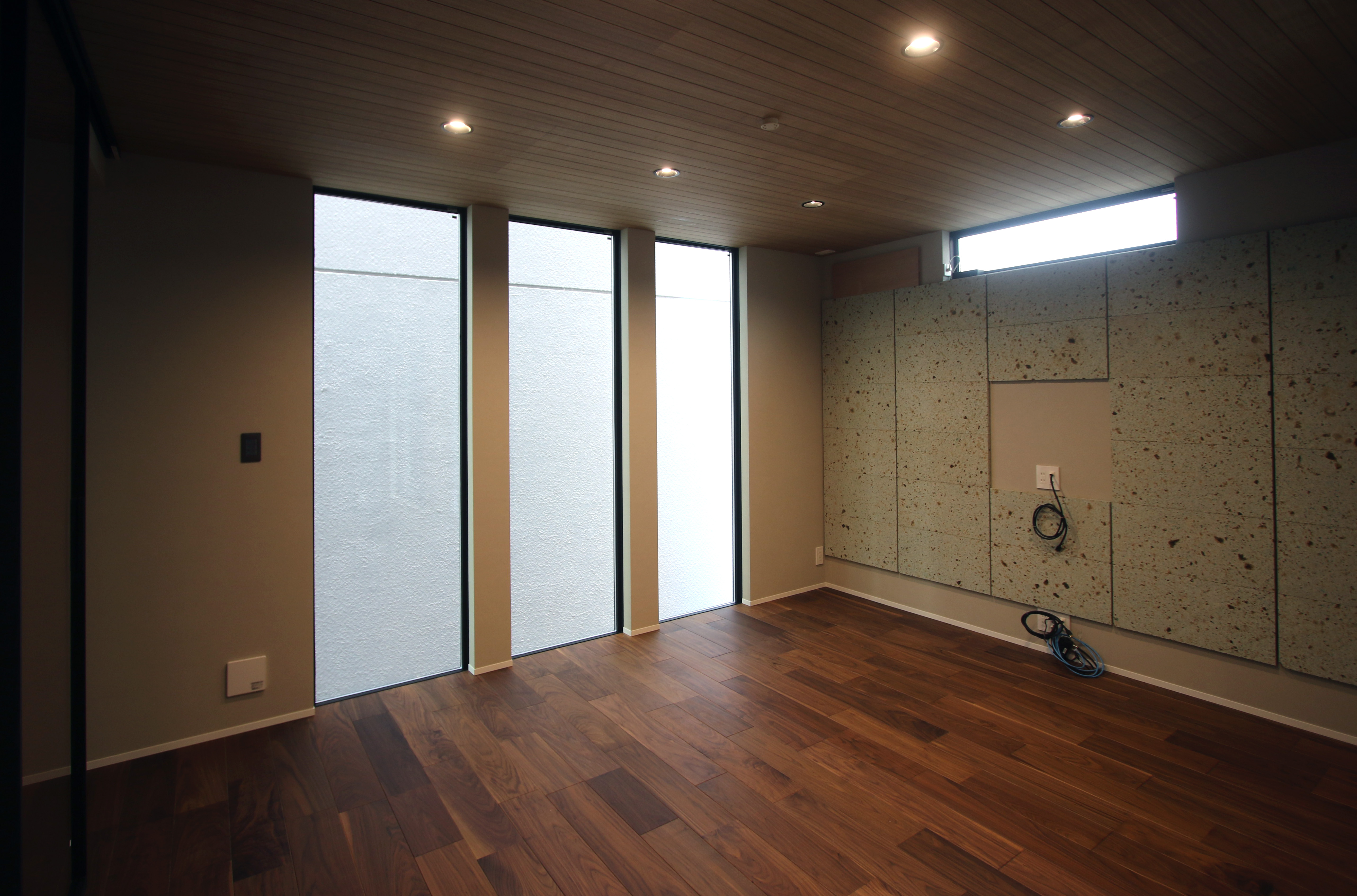 道路に面した1階にはワーキングスペースを設け、約5帖の大きなサニタリーに壁一面の特注洗面化粧台、そして長期優良住宅ではまず見かけない造作浴室を全面タイル貼りで仕上ました。
