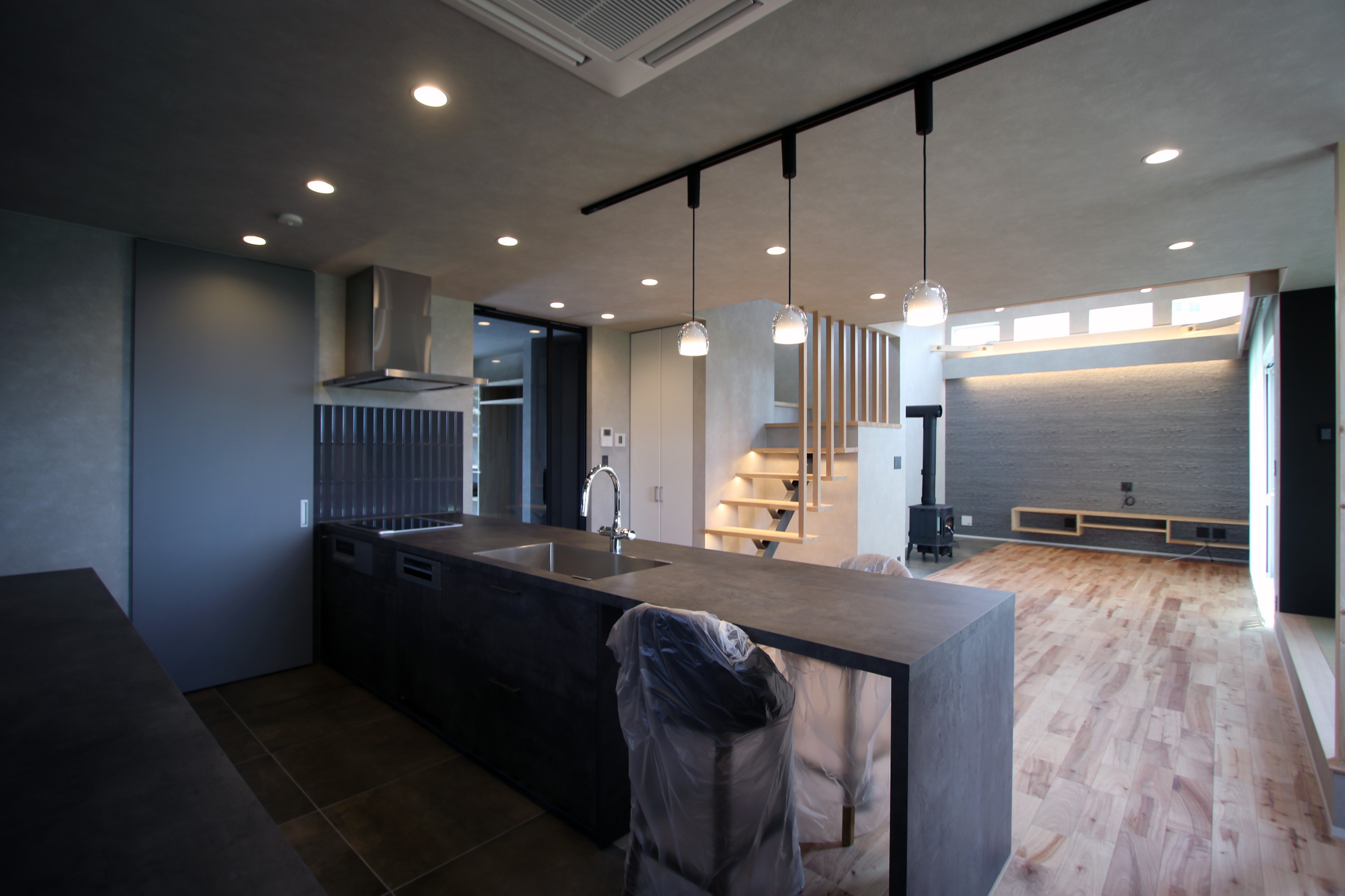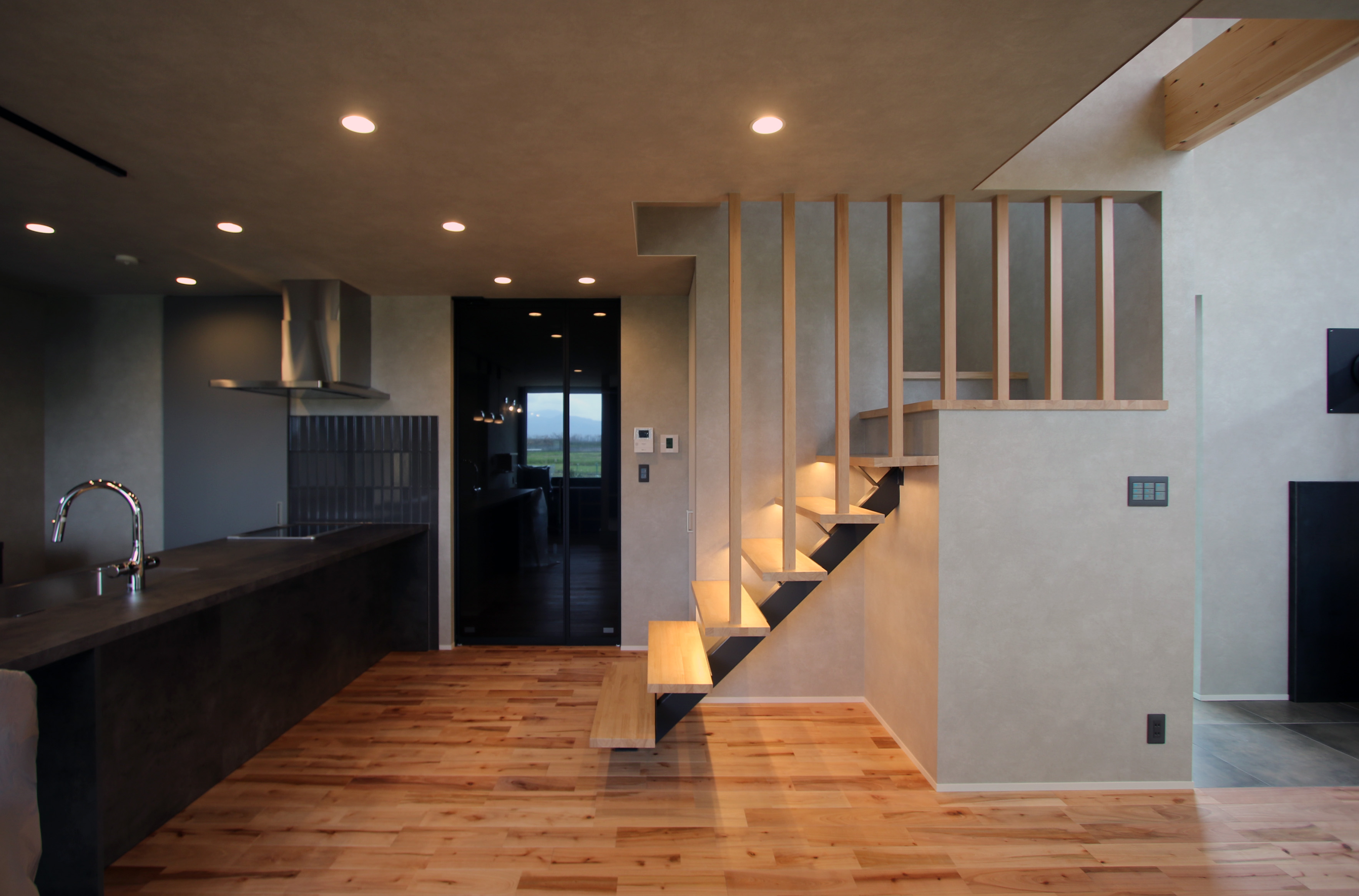 1階には土間収納と水周りの他には30帖以上の大きなLDKを設け、開放感のある勾配天井で、更に空間を広く演出いたしました。小上がりのコーナー和室が空間を柔らかにしてくれてます。