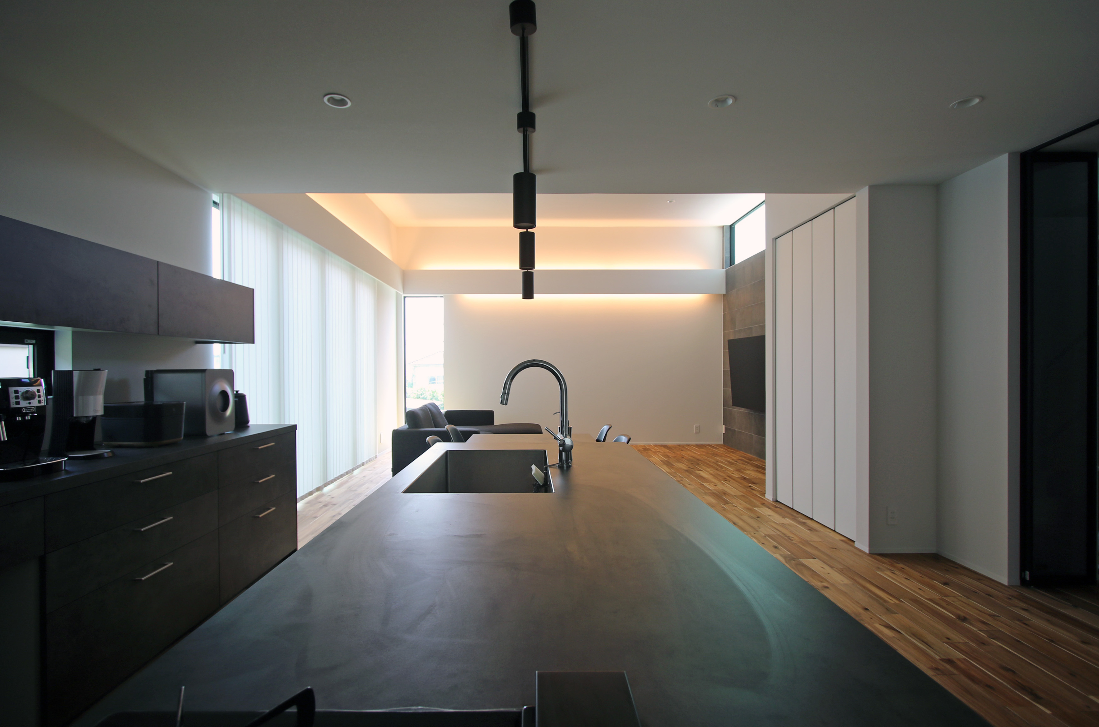 家は約50坪の大きな邸宅でLDKは30帖ほどある広い空間で、リビングの天井は3.5mの高さがある高天井にして高所に明り窓を設けて空間を広く・明るくなるよう設計。