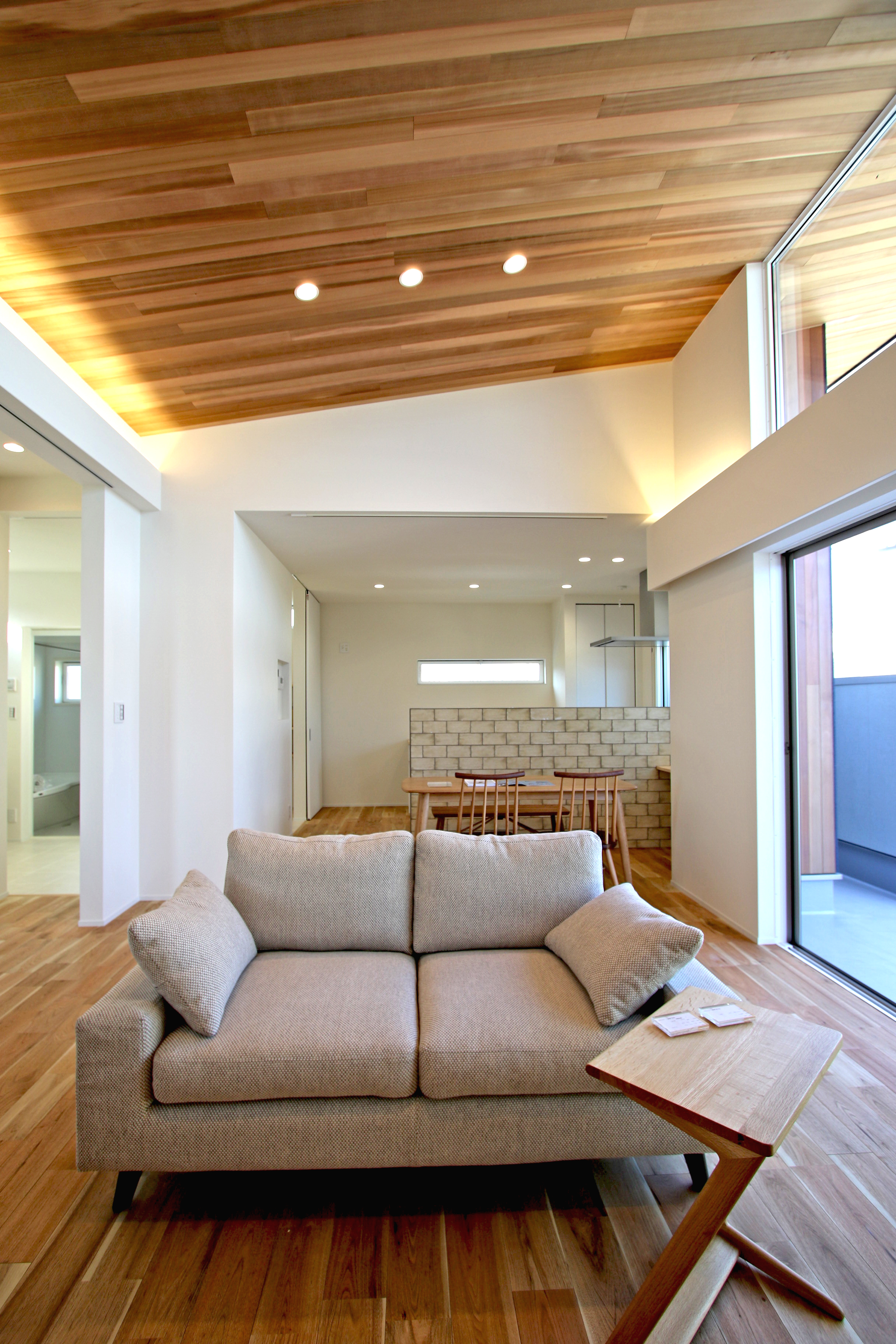 一連に続く勾配天井に張ったレッドシダーパネルがこの家のコンセプトです。