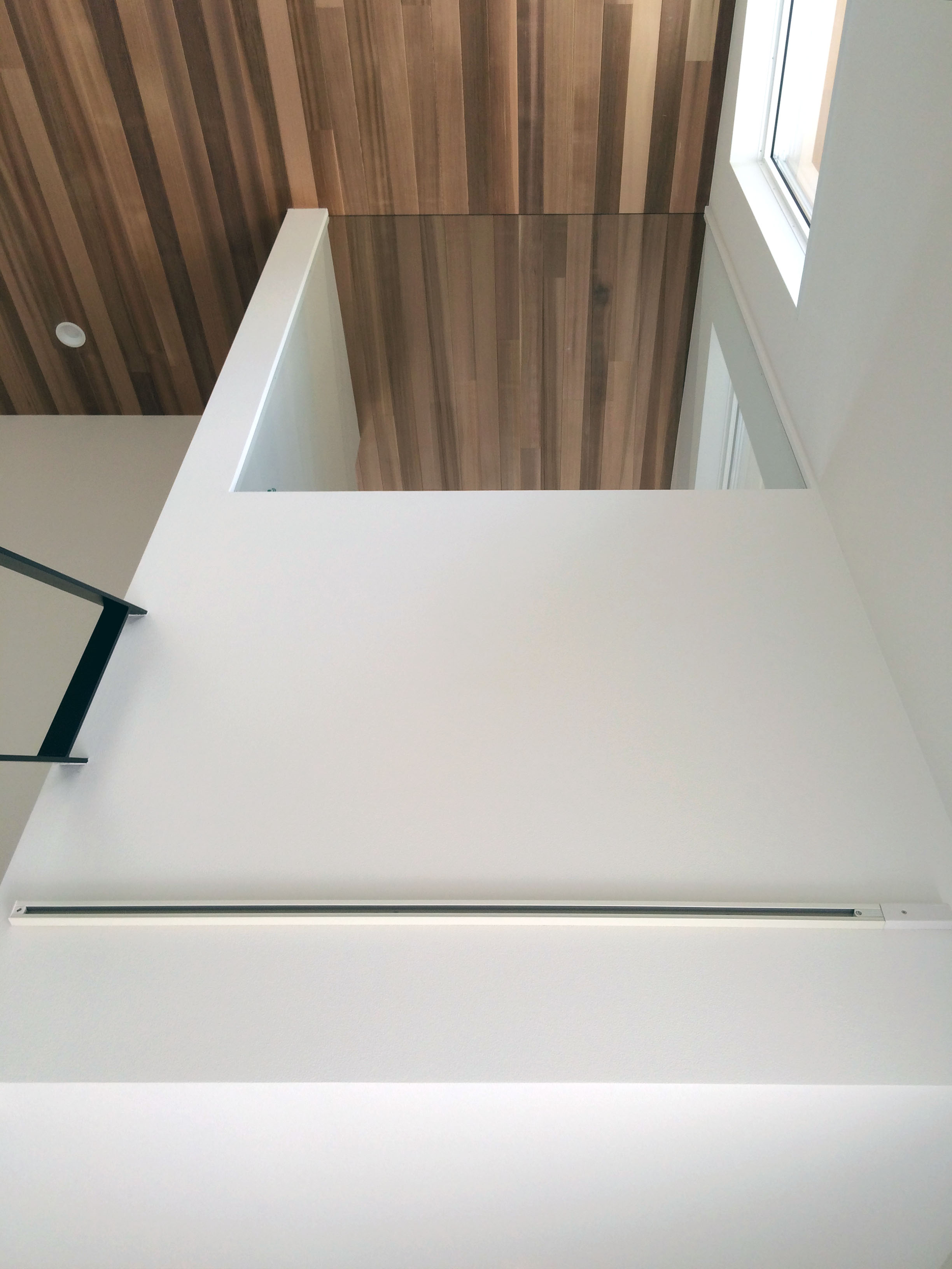 玄関ホールの吹き抜けからリビングを経てバルコニーに張り出した庇まで