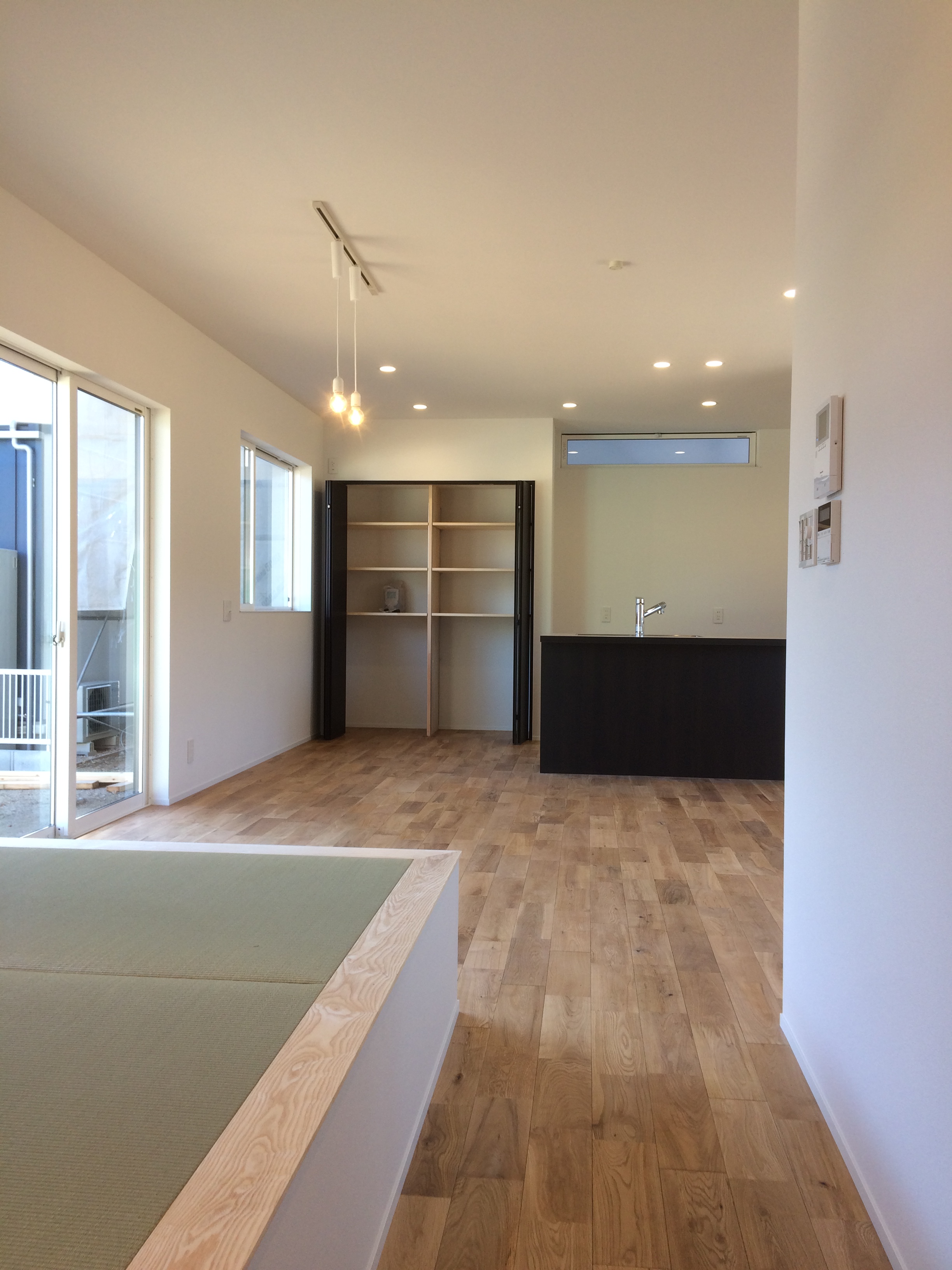 軒天にレッドシダーパネルをあしらい上下で2ブロックに別れる家を設計しました。