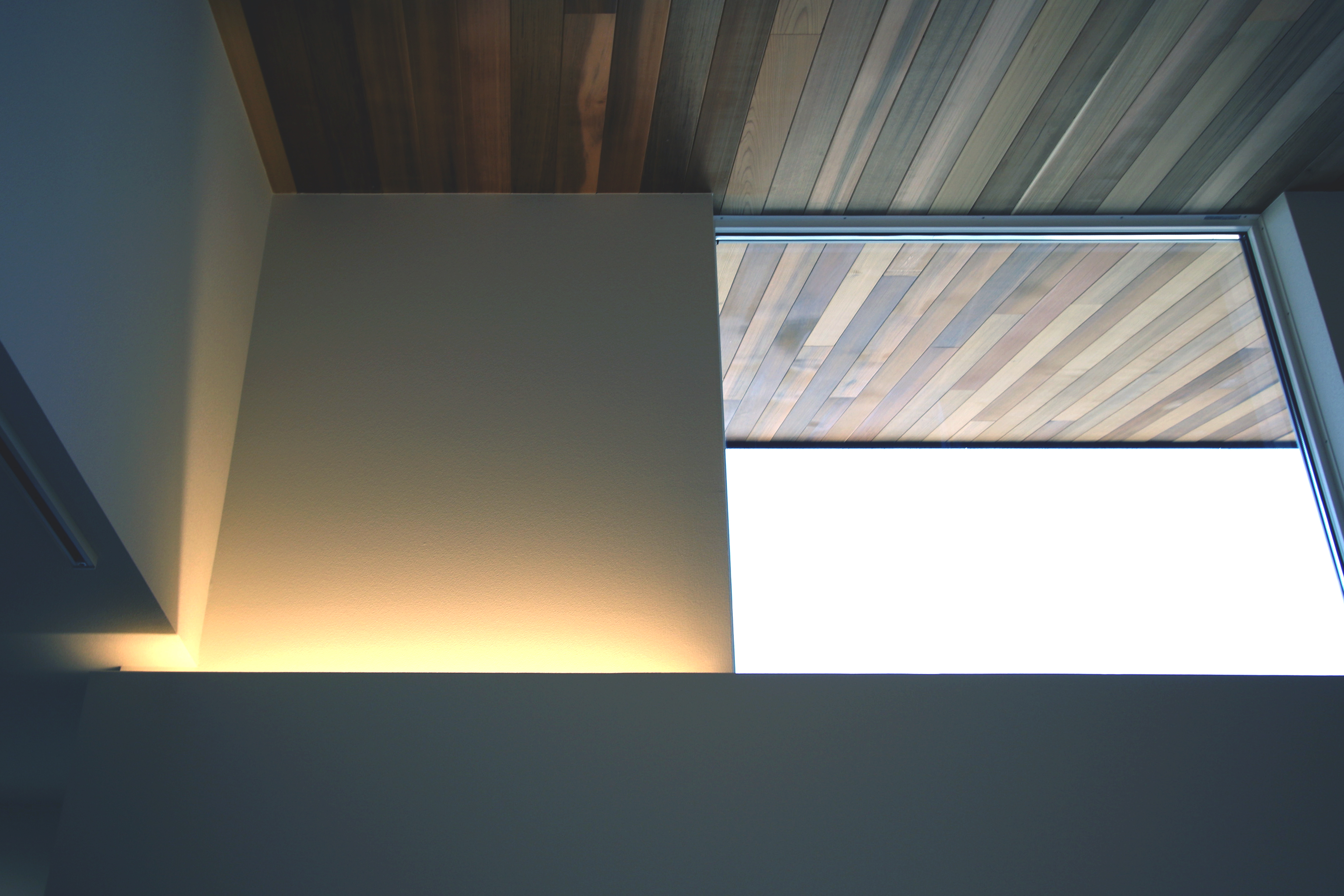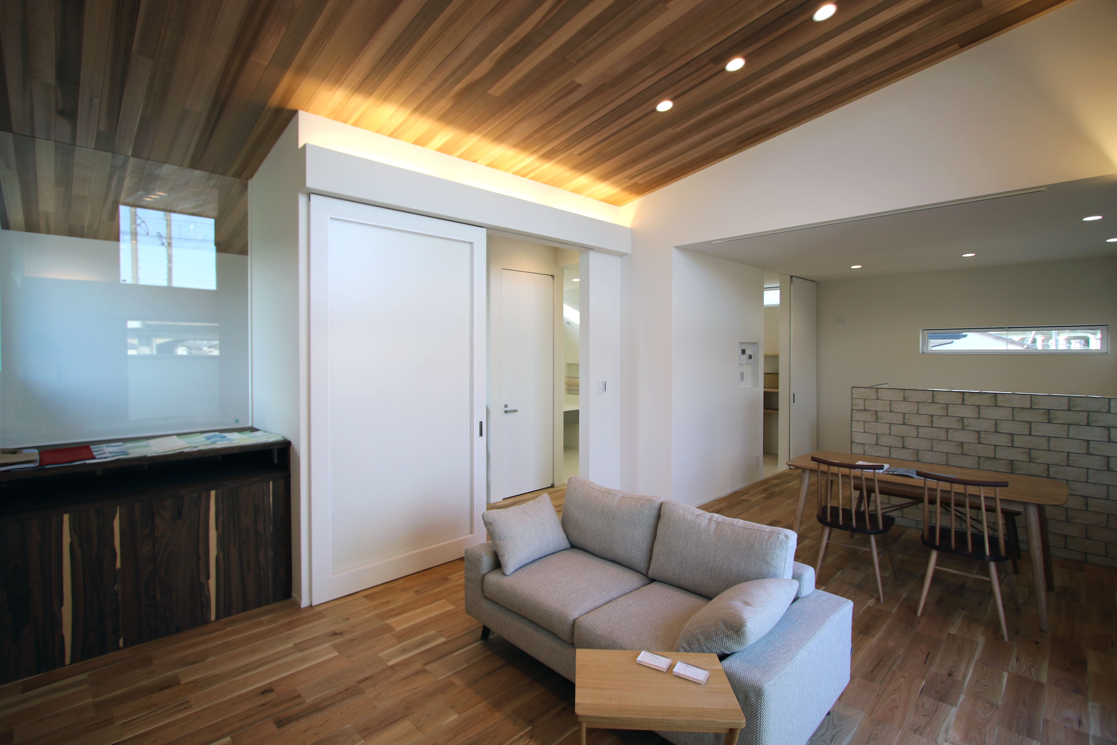 一連に続く勾配天井に張ったレッドシダーパネルがこの家のコンセプトです。