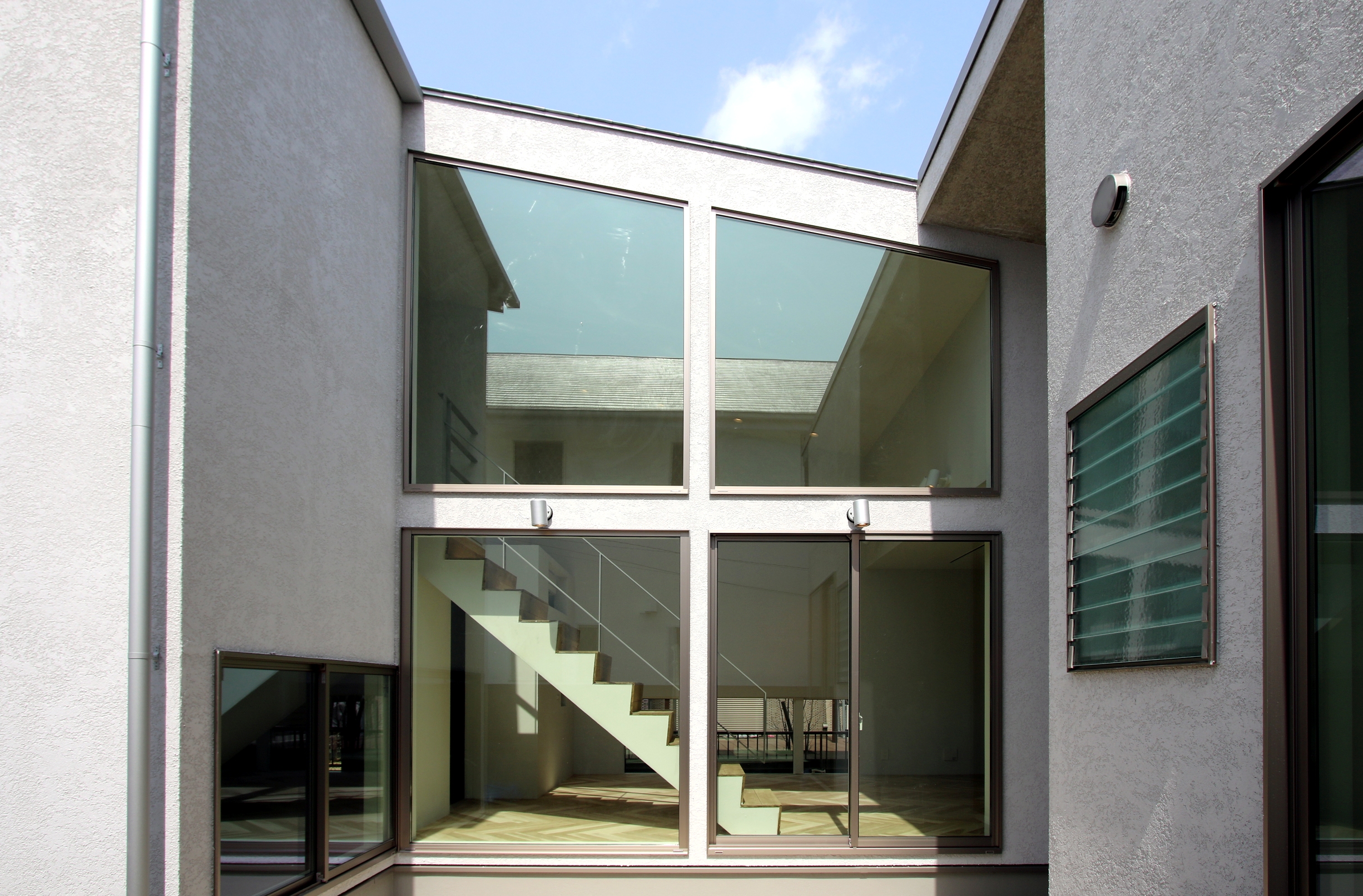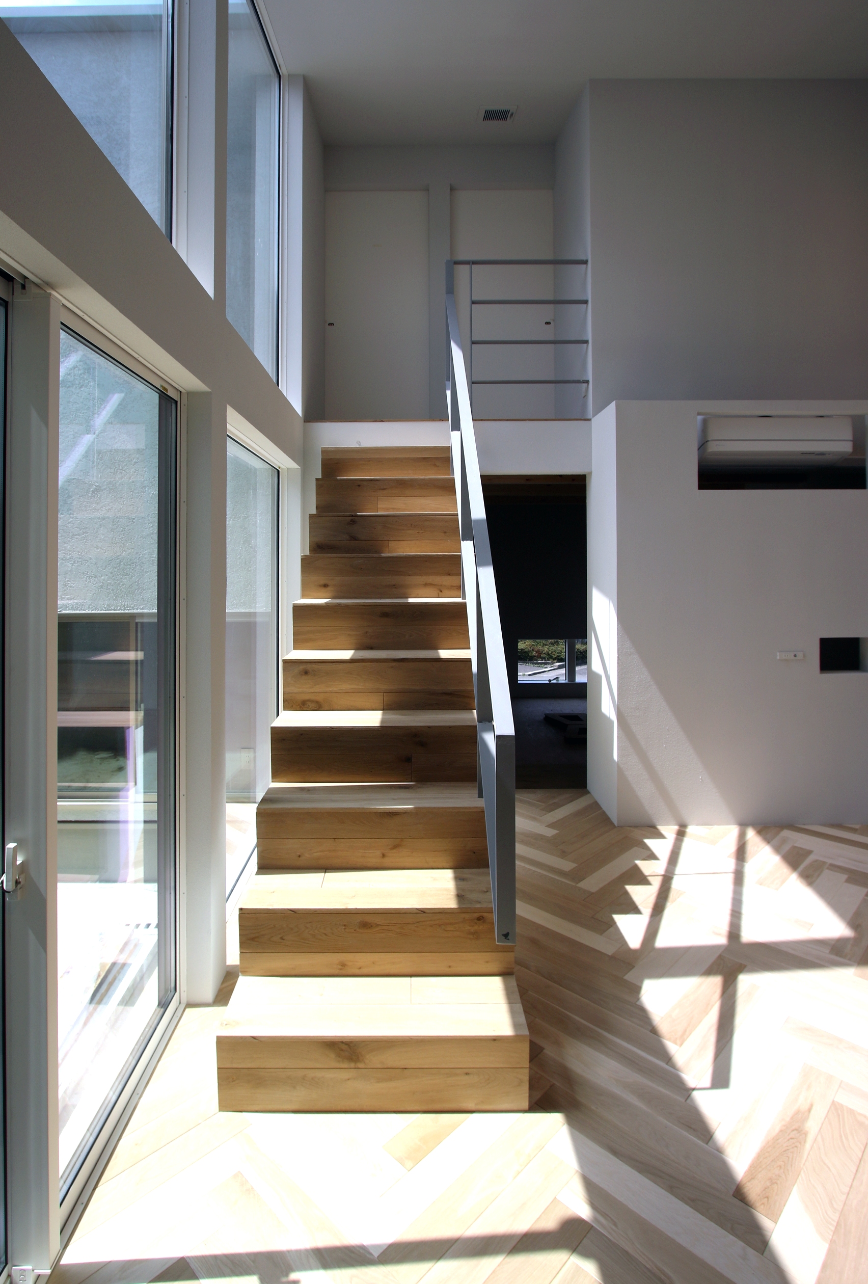 リビングの大きな窓の脇に備え付けた階段は美術館のエントランスから上へと誘う