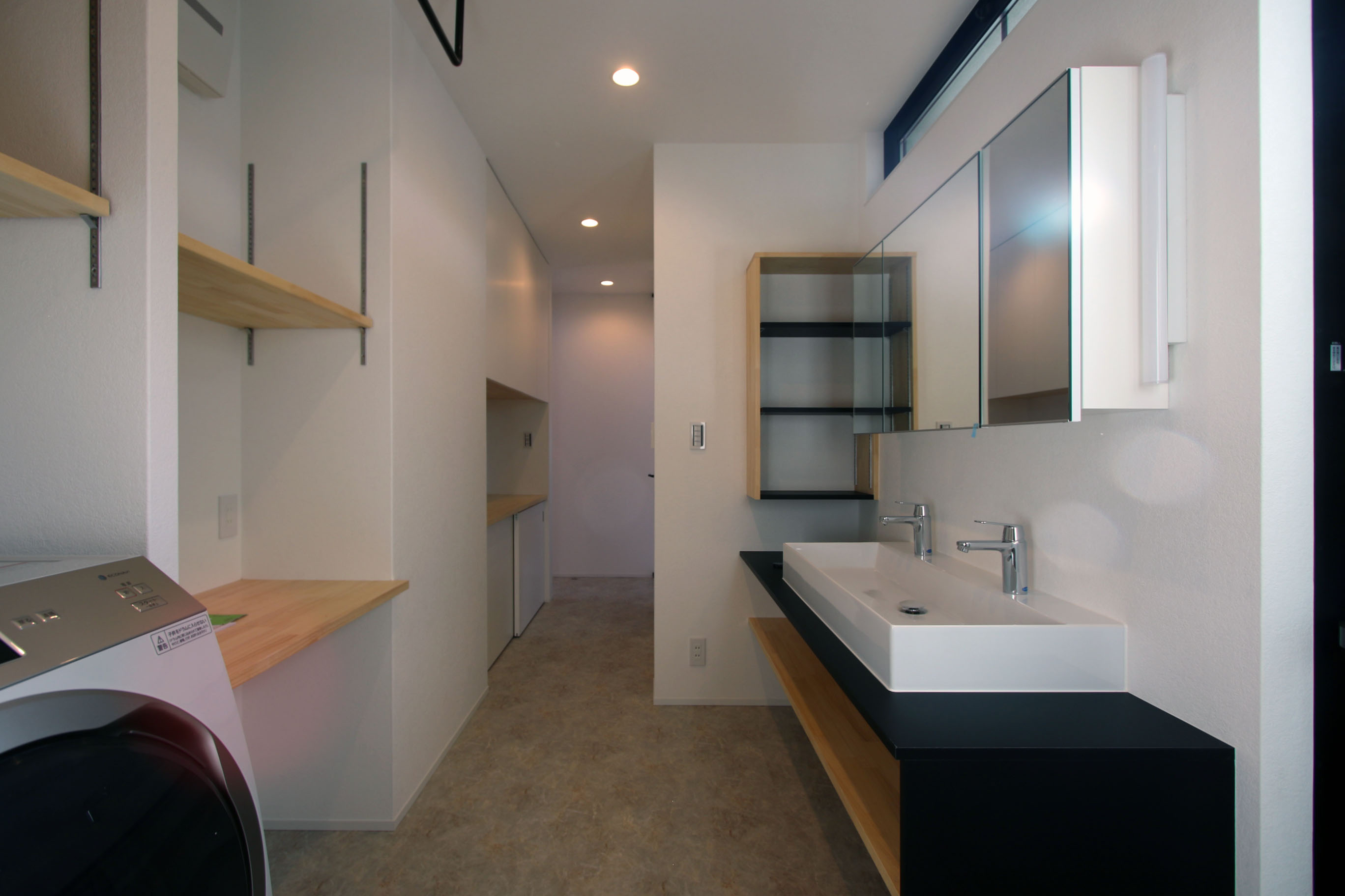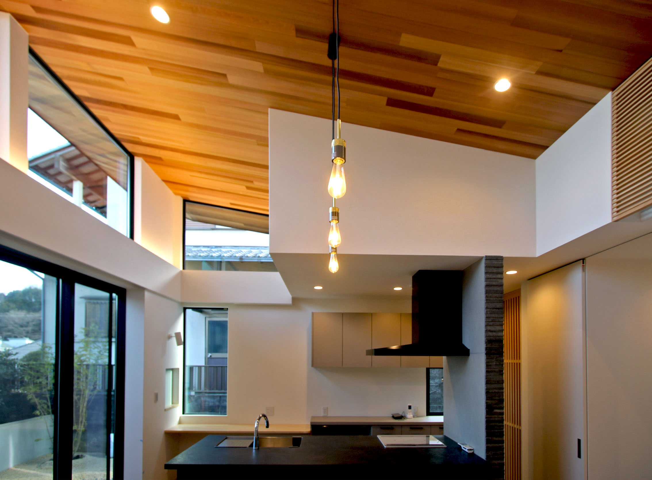 道路から高台になっていた土地を擁壁を撤去し、4台以上の駐車スペースを取るとともに敷地を最大限利用できるように3層目のスペースを大きく持ち出した家です。