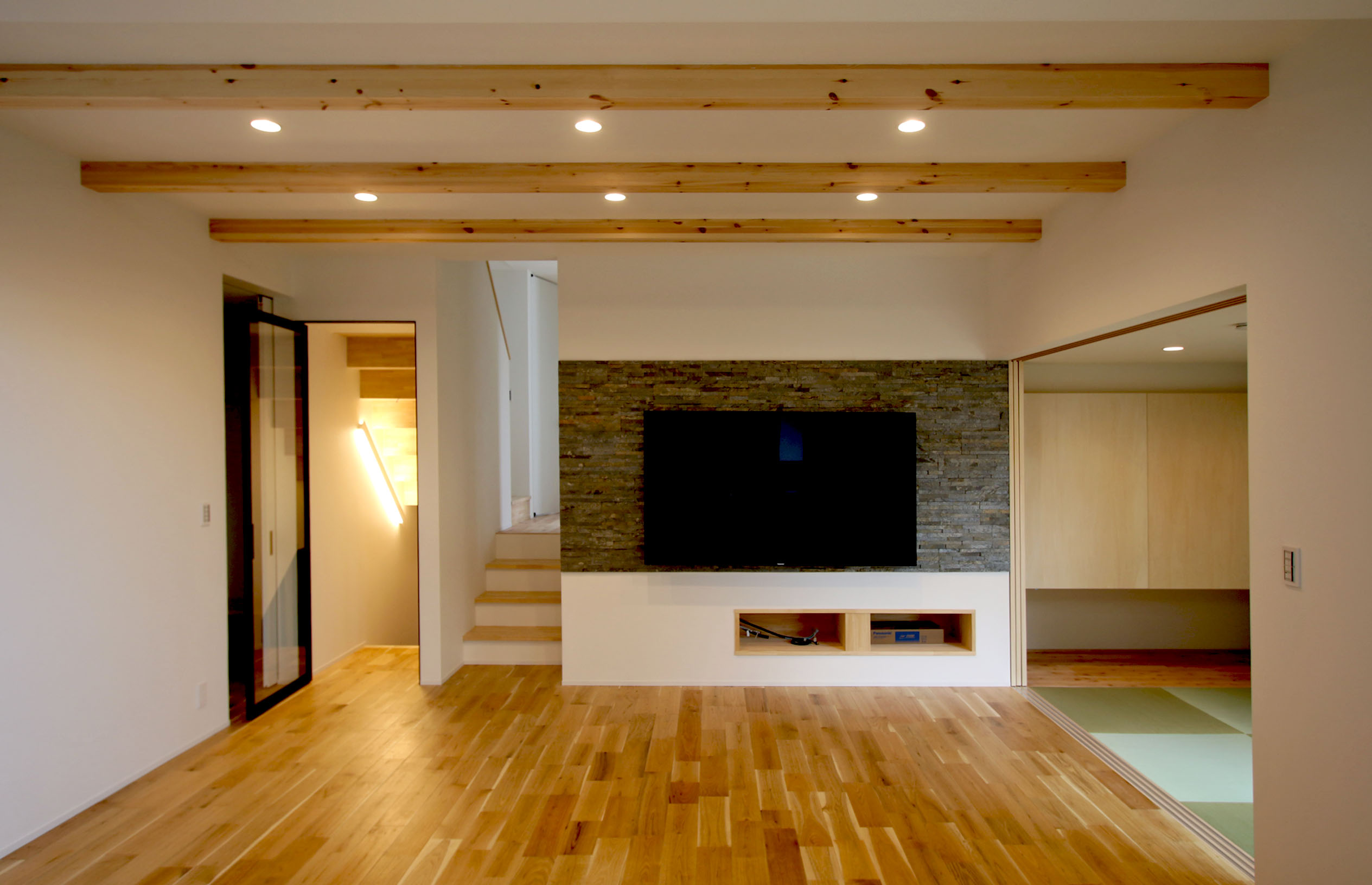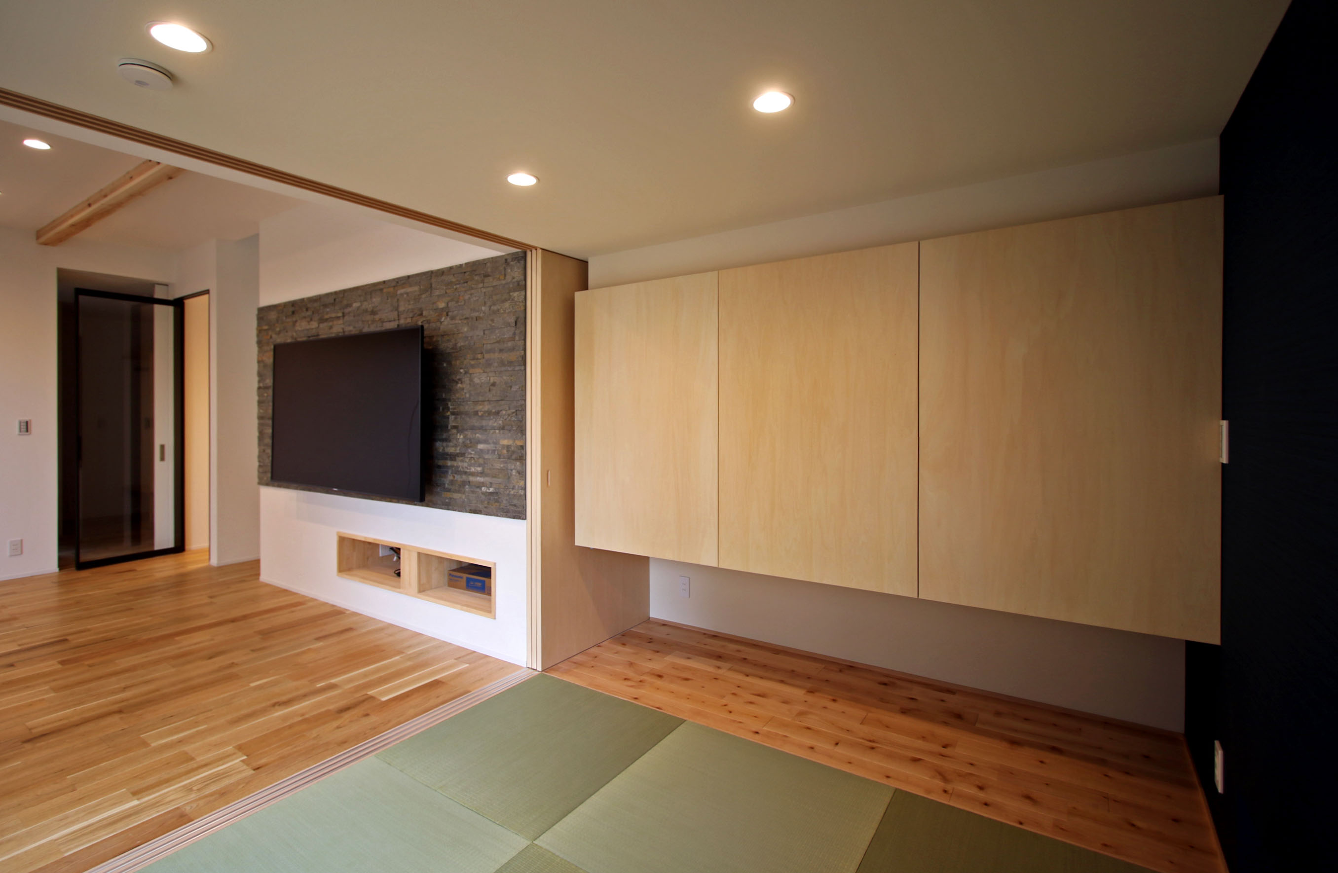 玄関スペースの1層目からメインであるLDK・水周りの2層目、持ち出した3層目には子供部屋を取り、最上階の4層目には主寝室と琵琶湖が見えるバルコニーを配置。