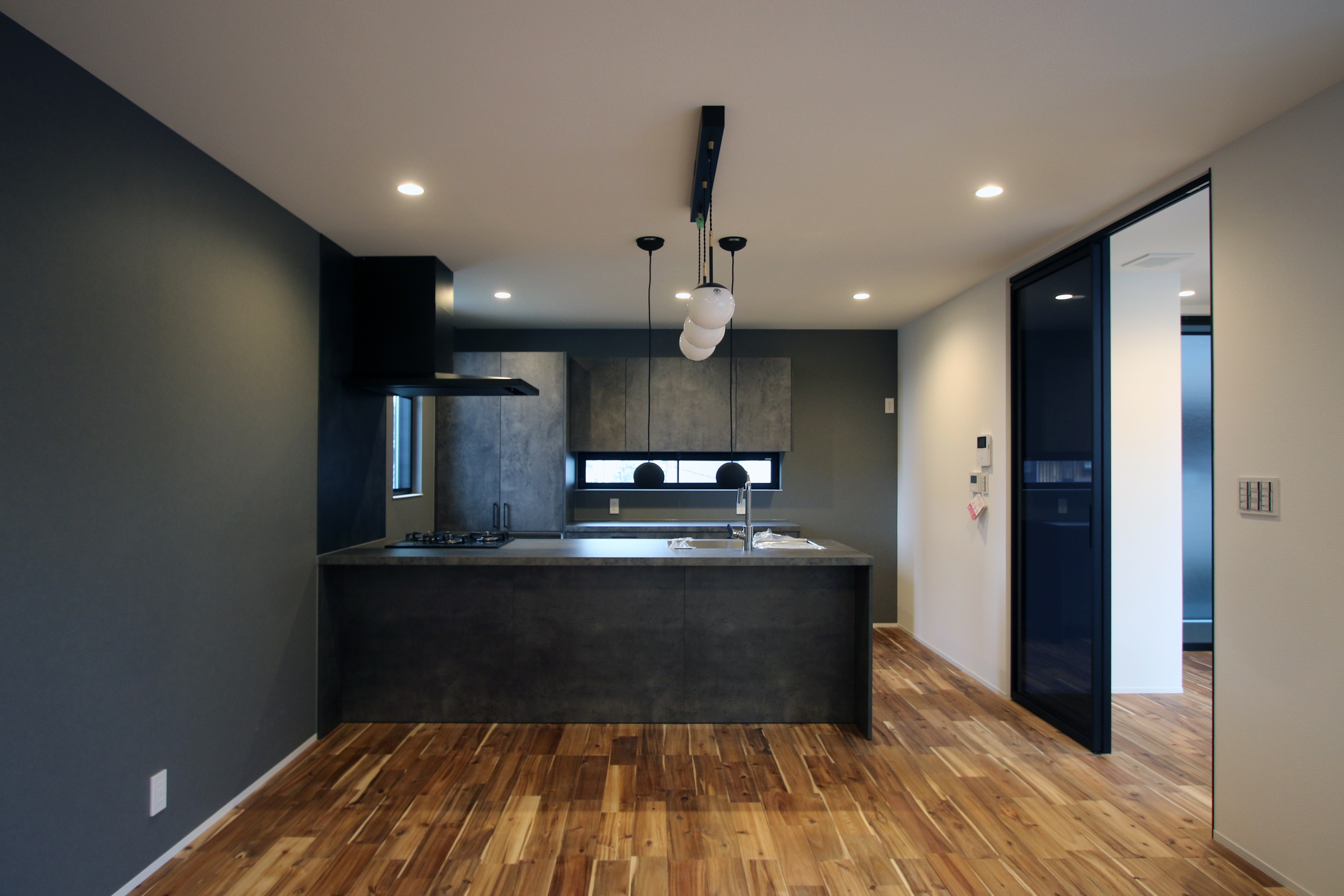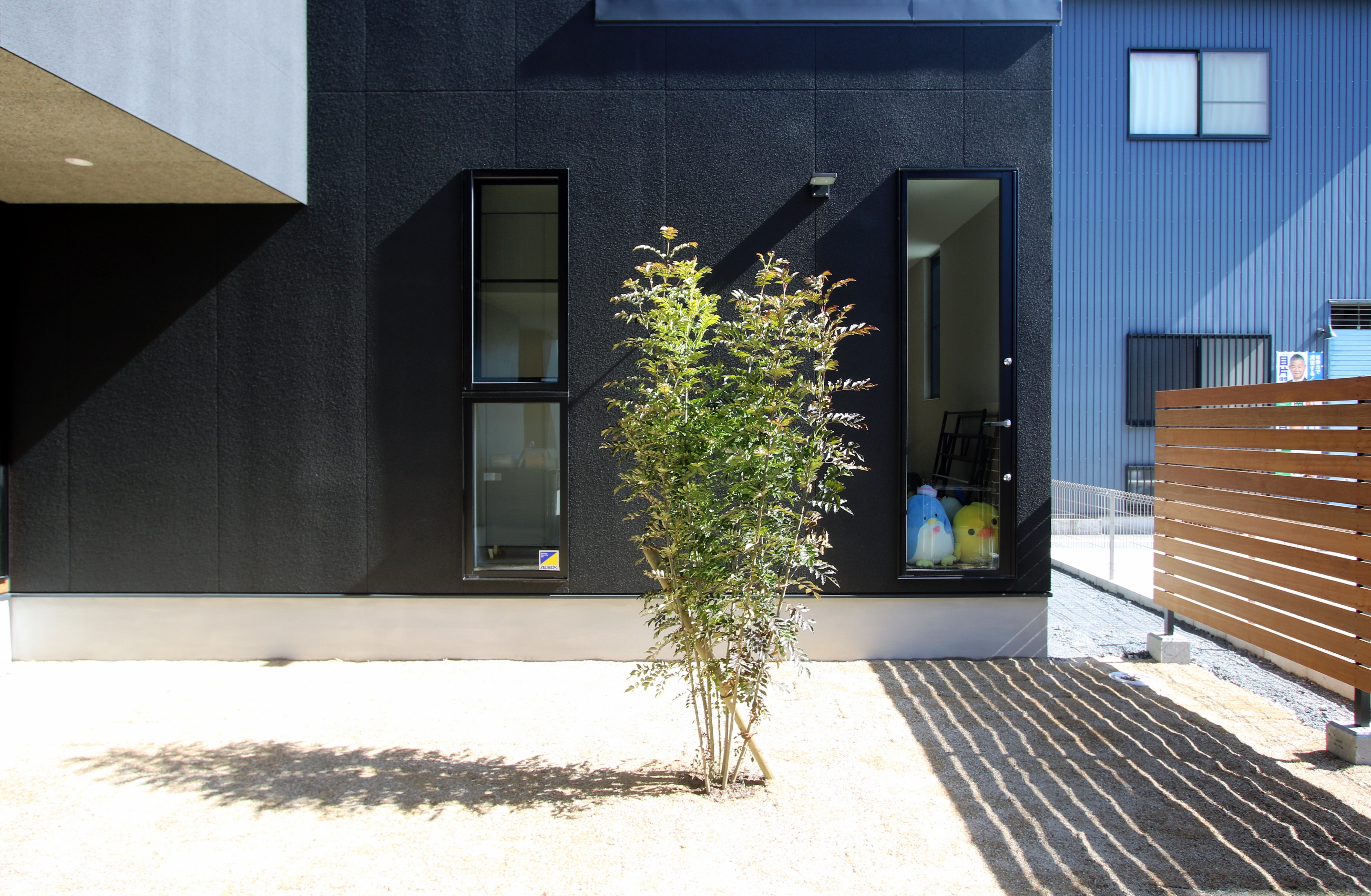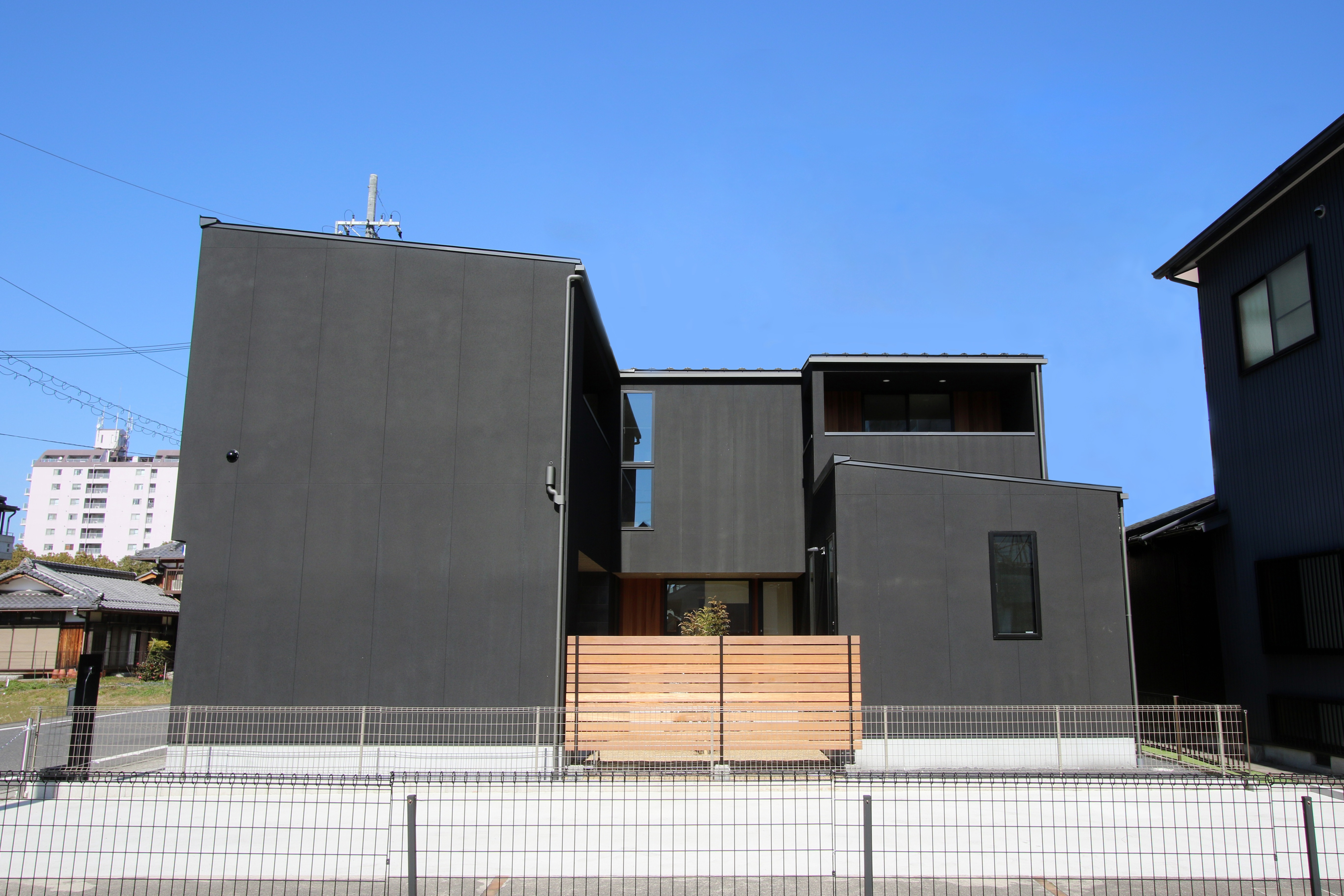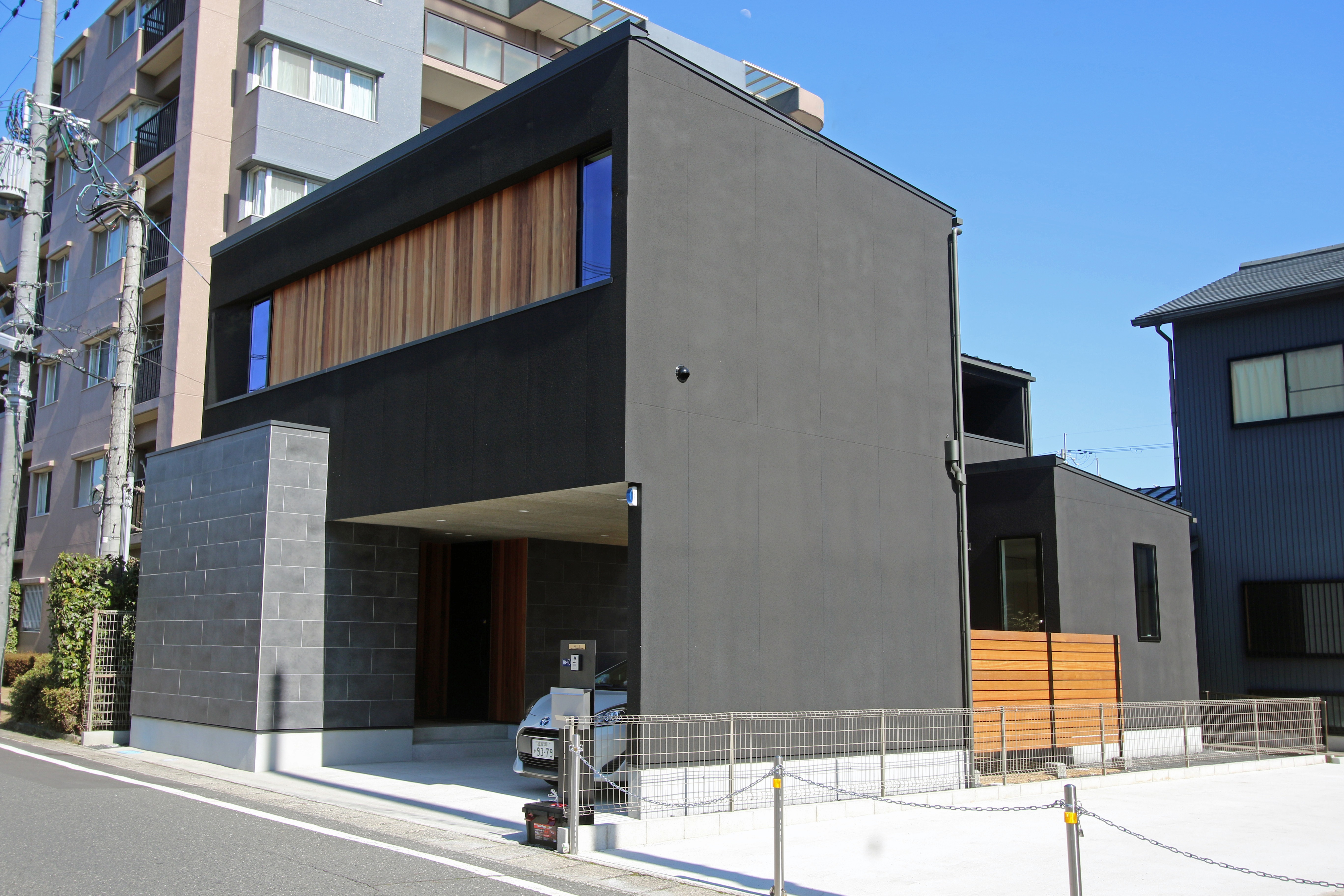 黒い外壁にグレーのタイル貼り。そして眼を引くウッドウォールが美しく映えるシックな家がになりました。