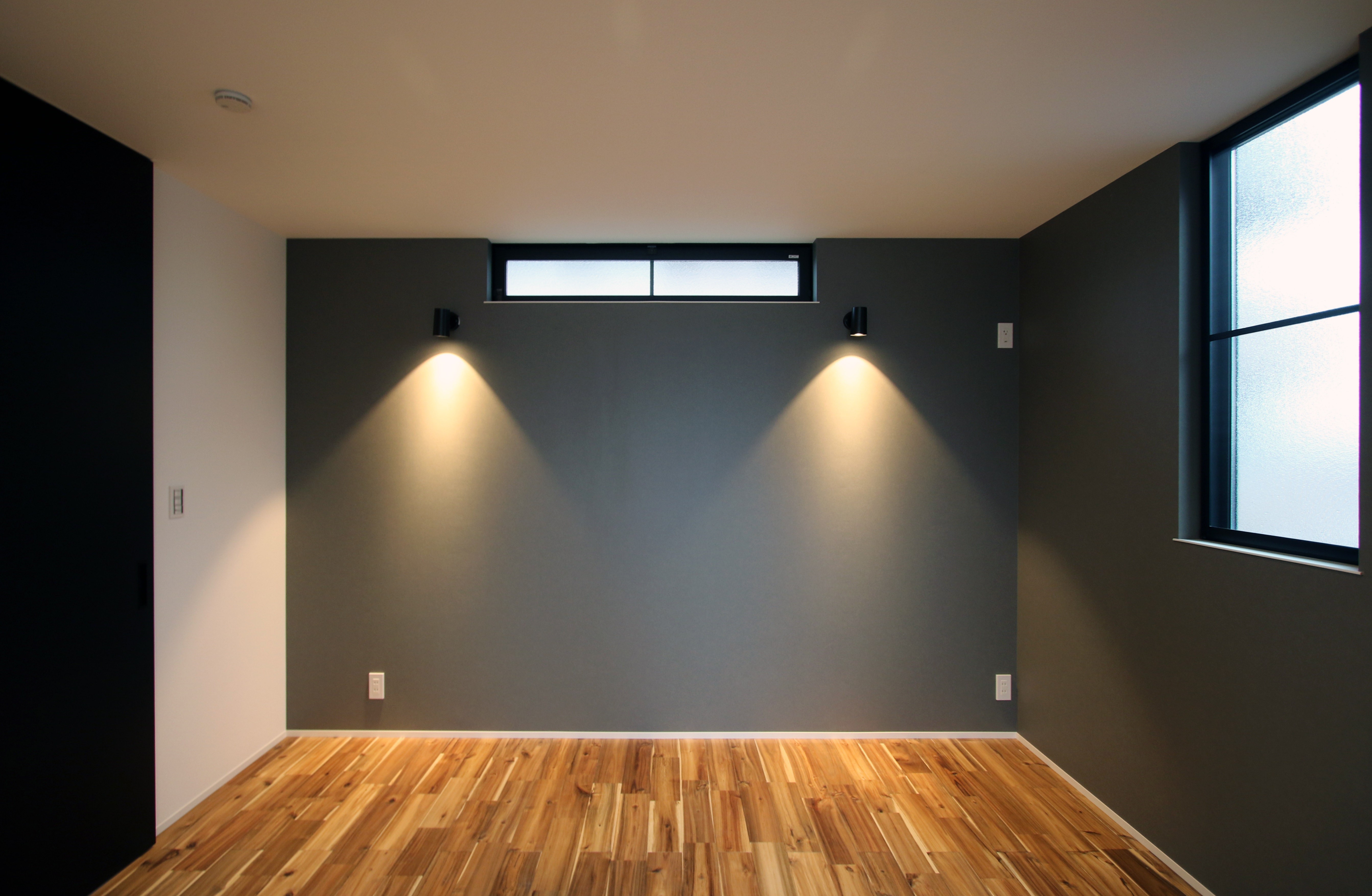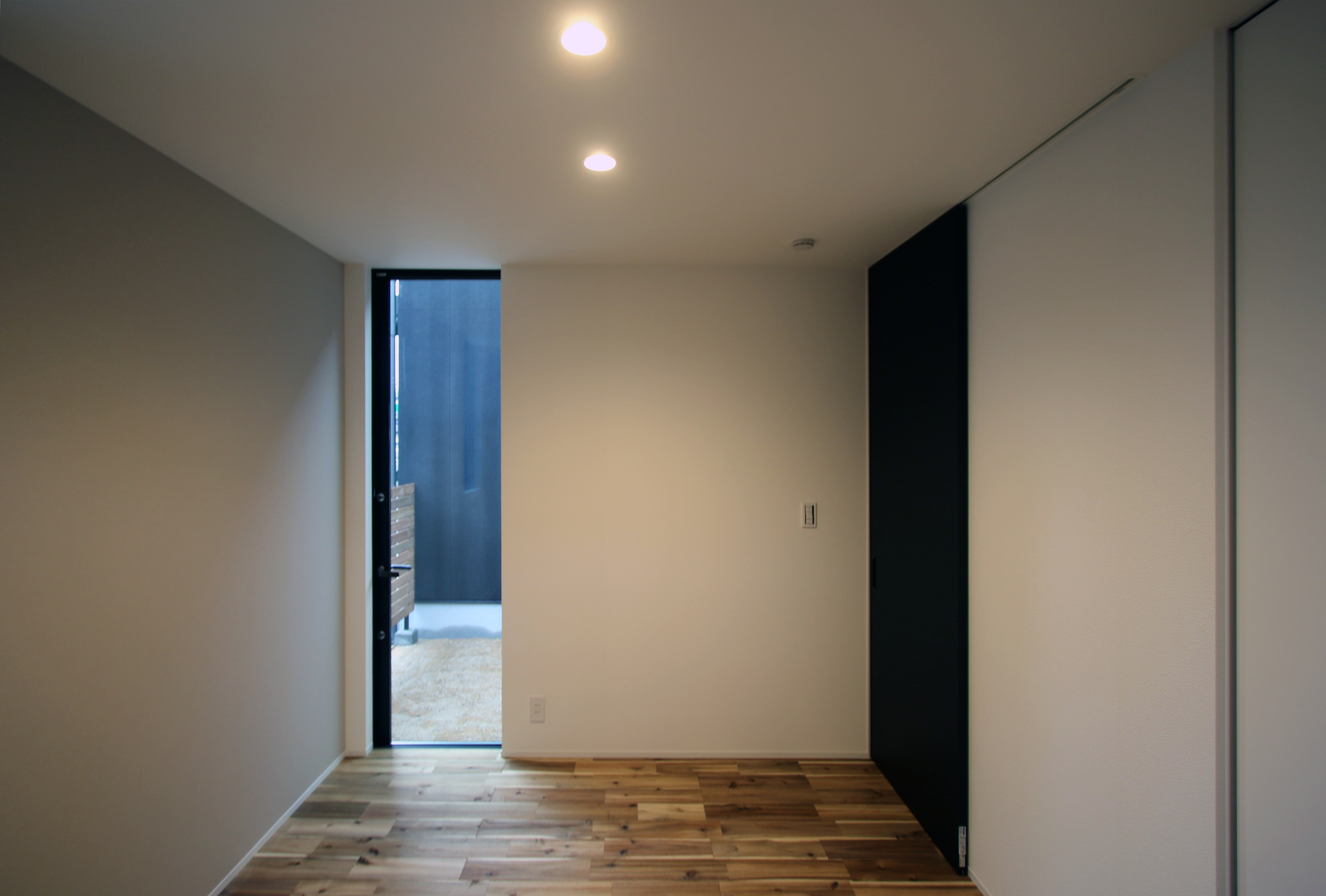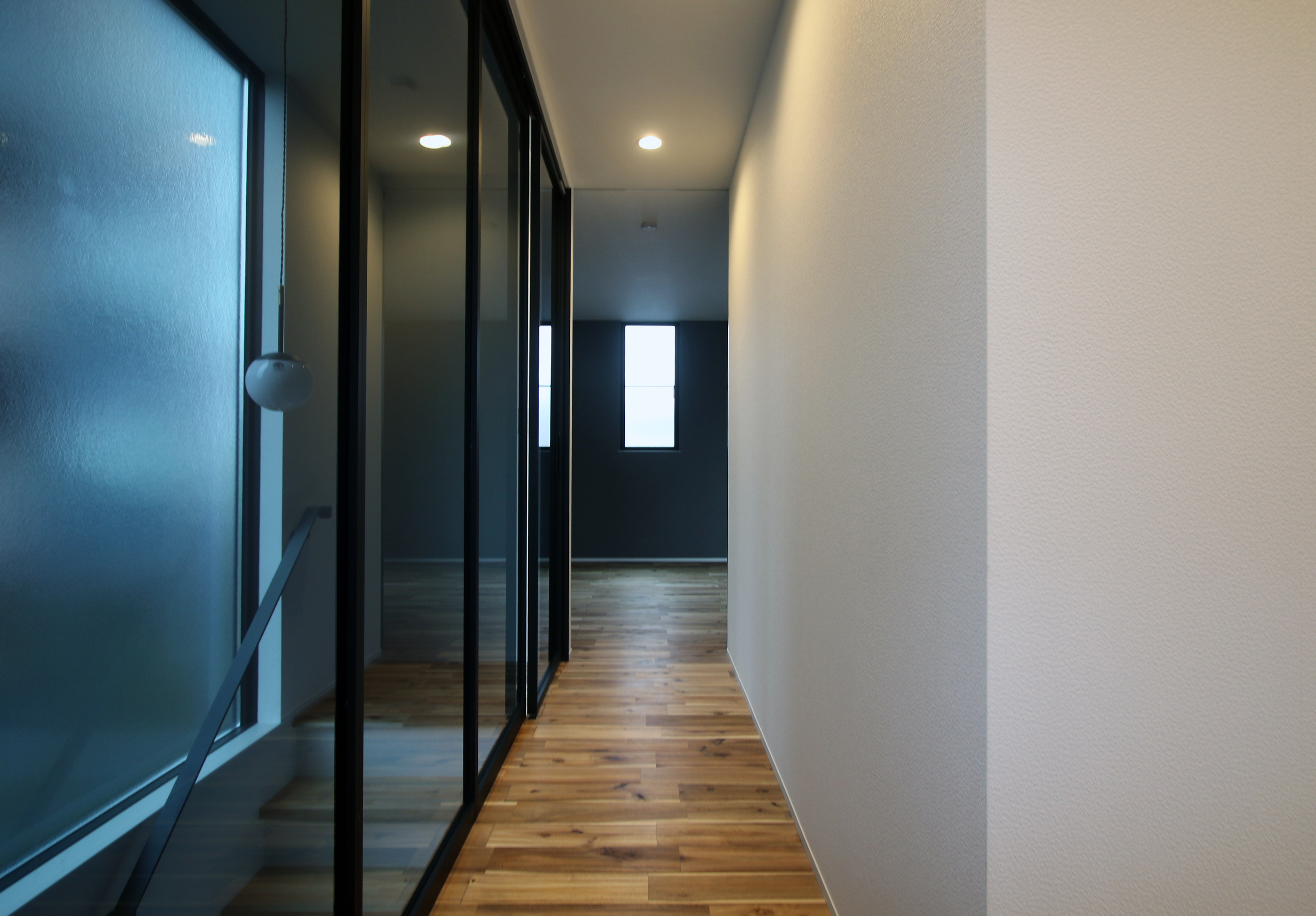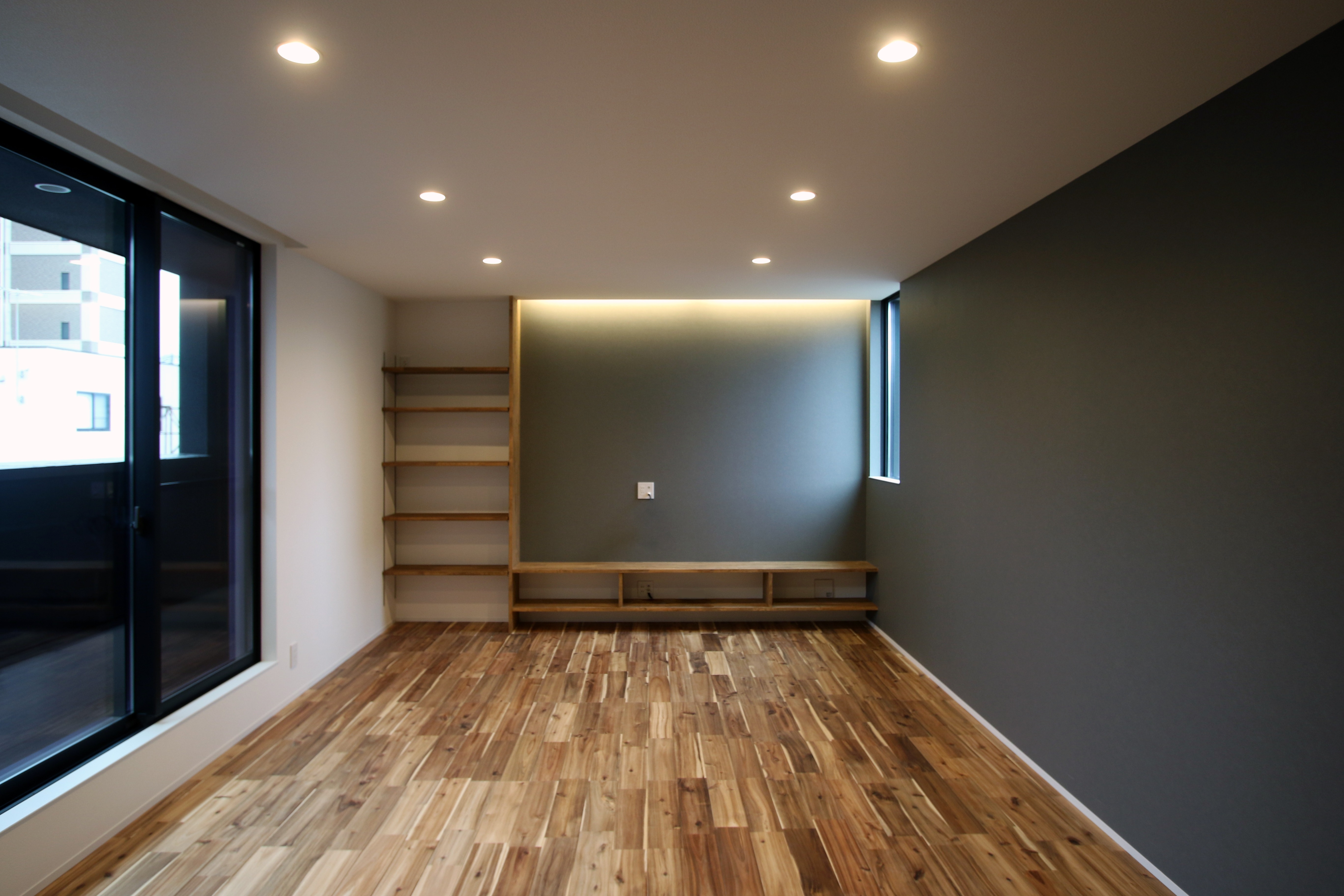 黒い外壁にグレーのタイル貼り。そして眼を引くウッドウォールが美しく映えるシックな家がになりました。