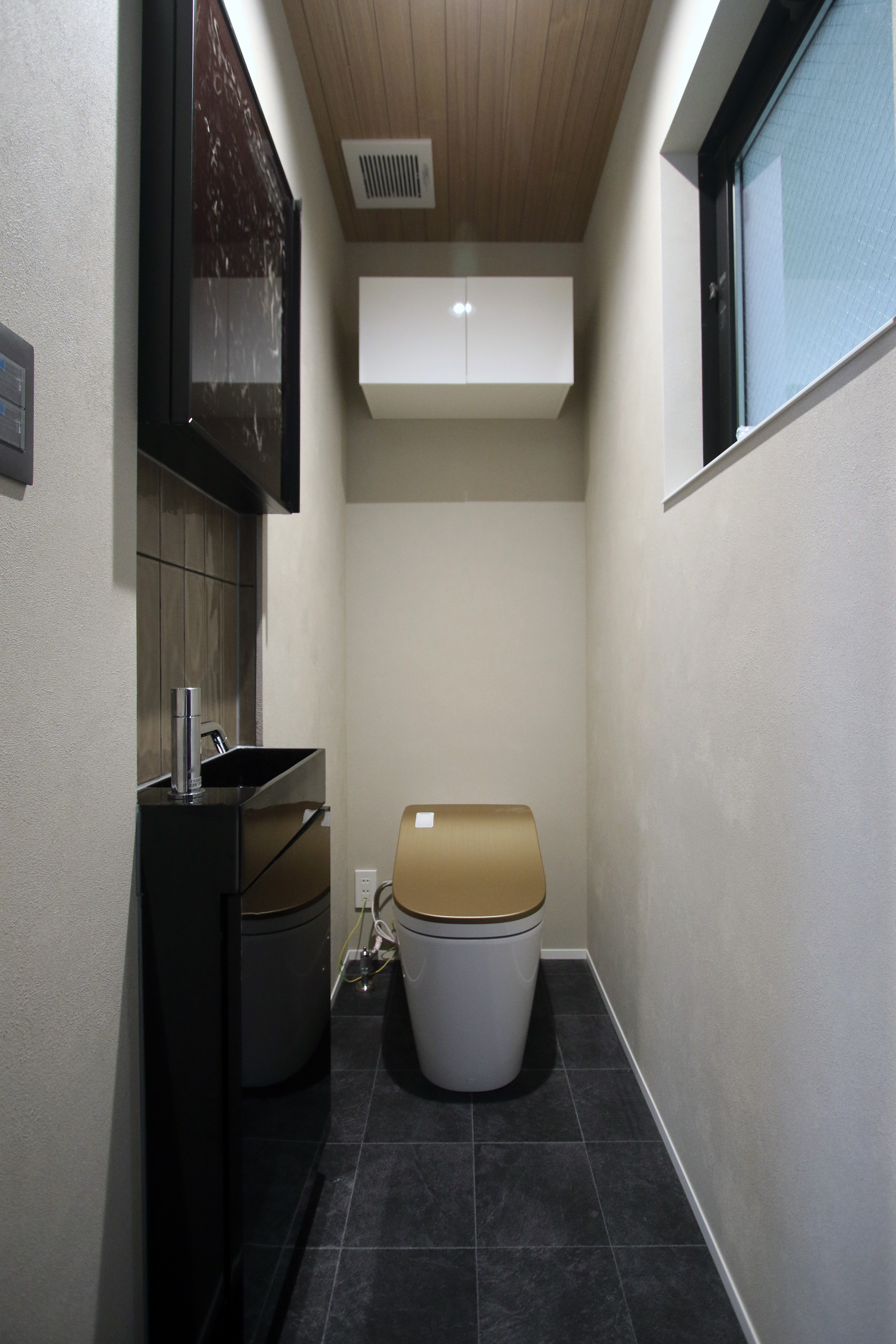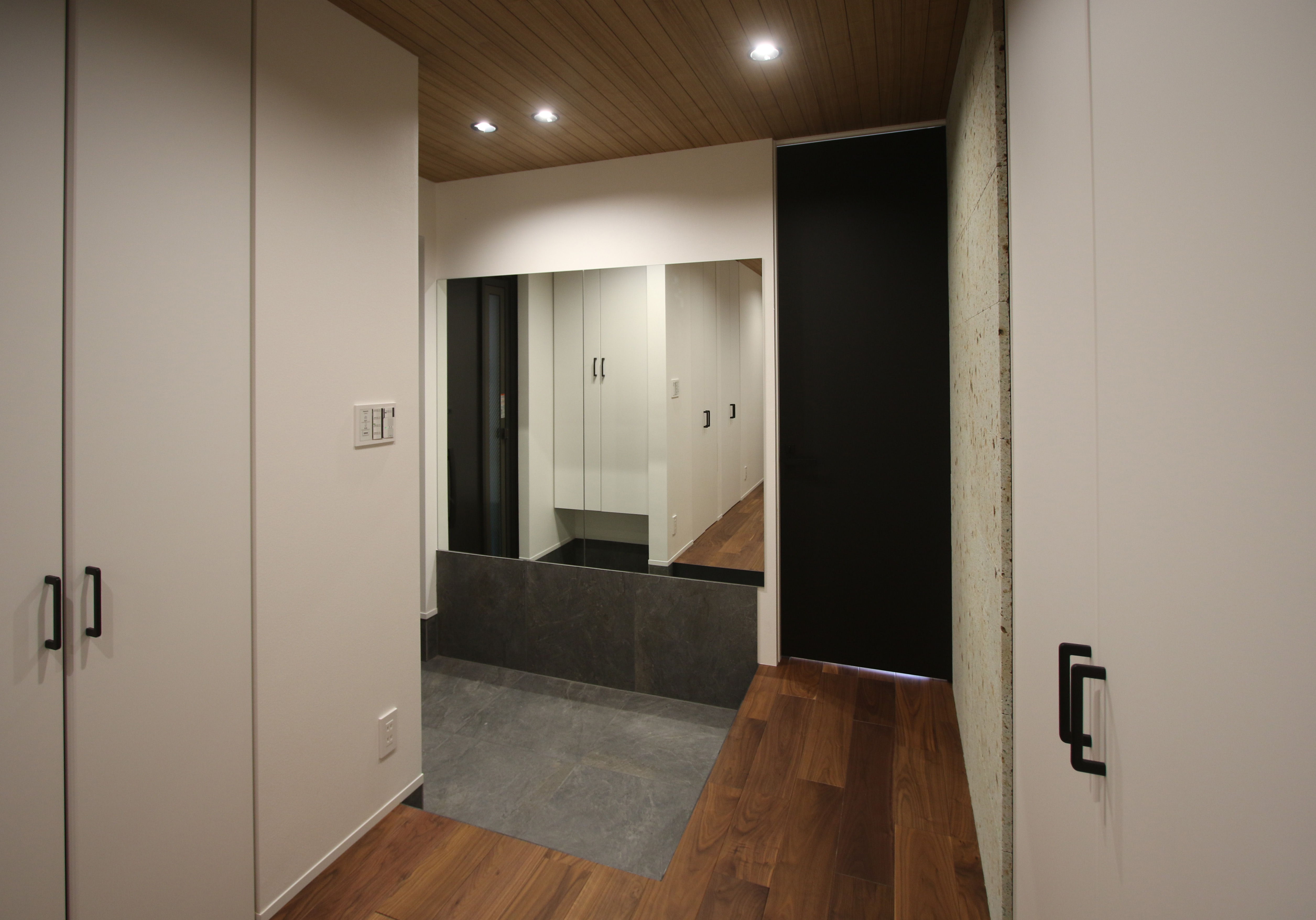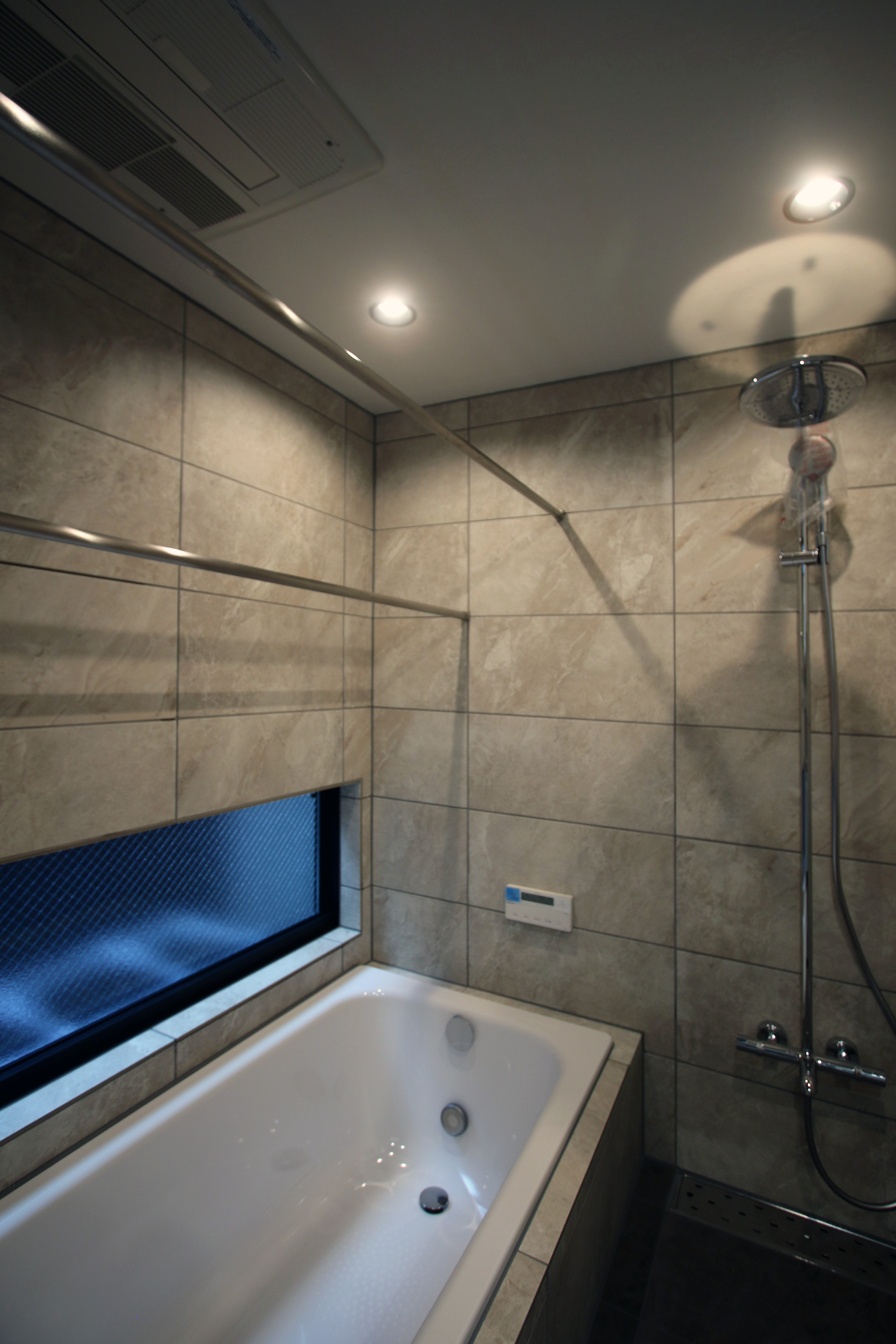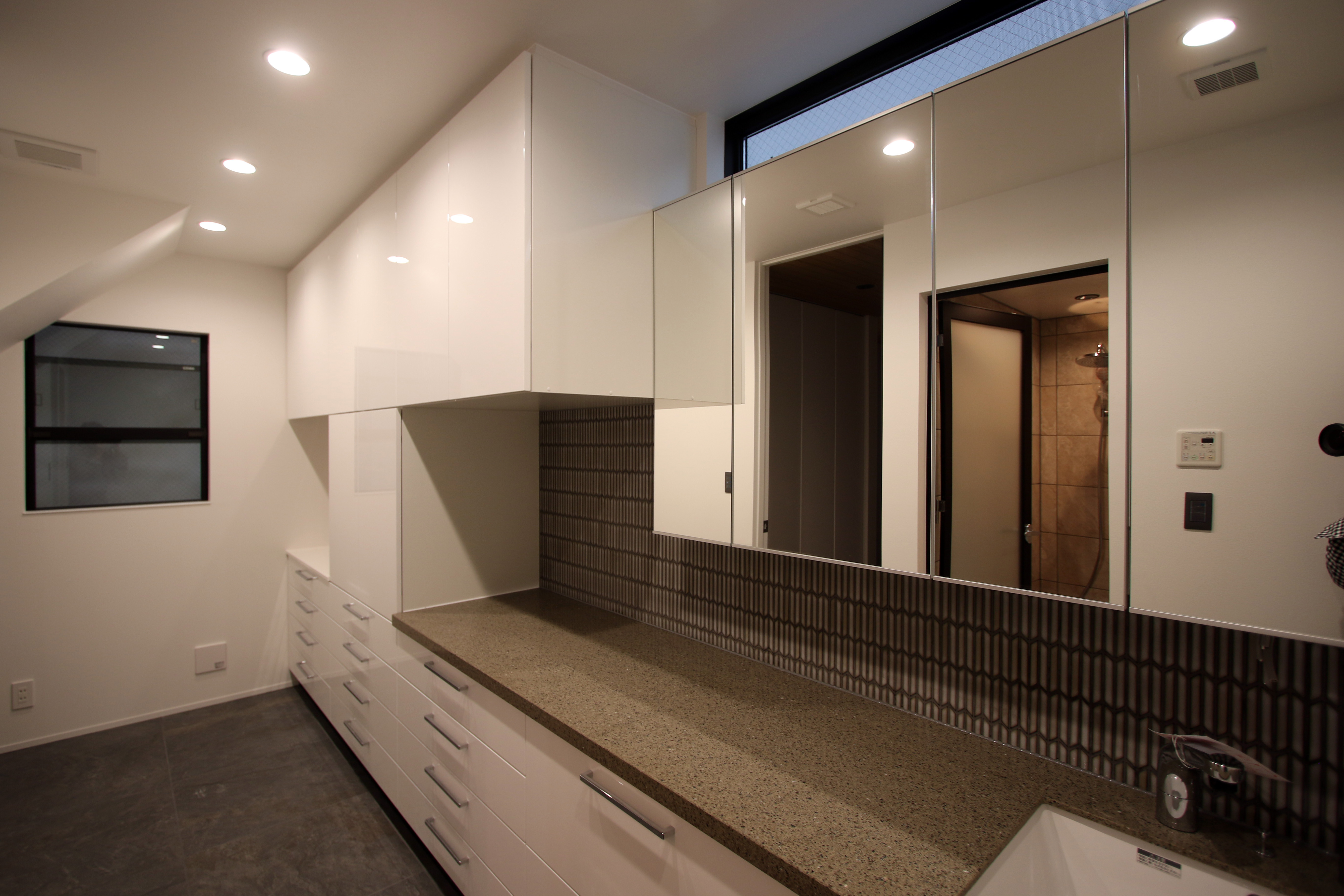 道路に面した1階にはワーキングスペースを設け、約5帖の大きなサニタリーに壁一面の特注洗面化粧台、そして長期優良住宅ではまず見かけない造作浴室を全面タイル貼りで仕上ました。