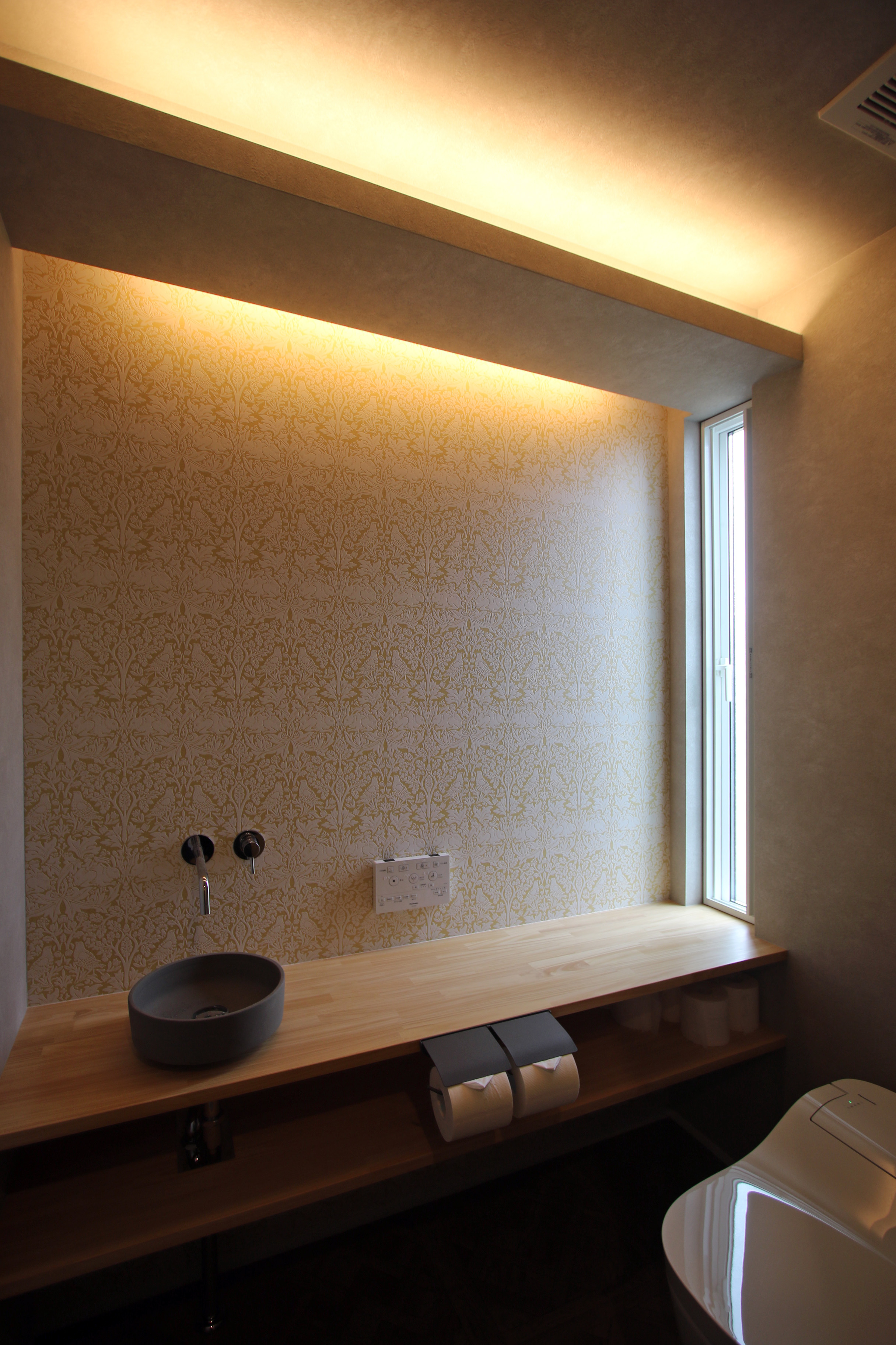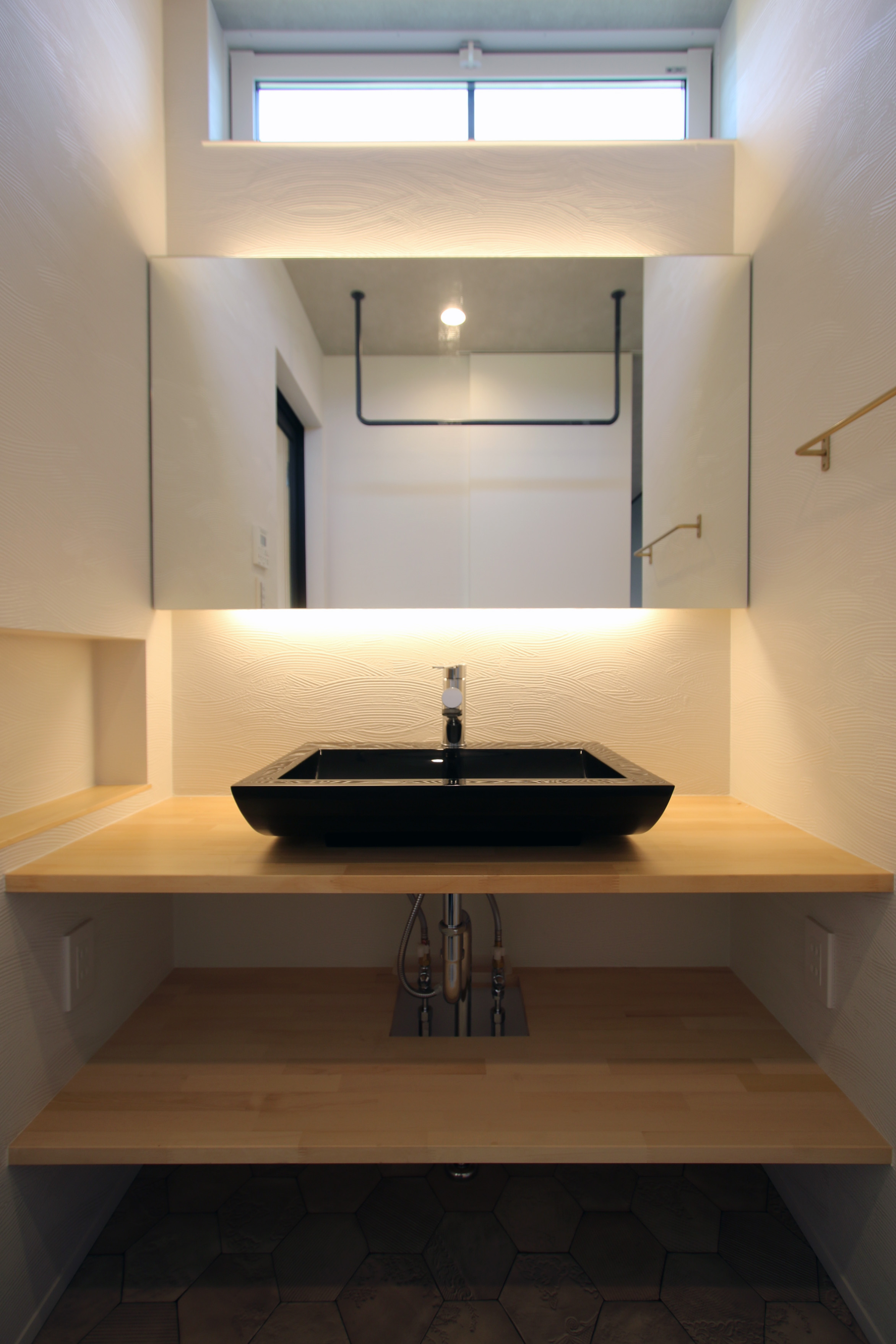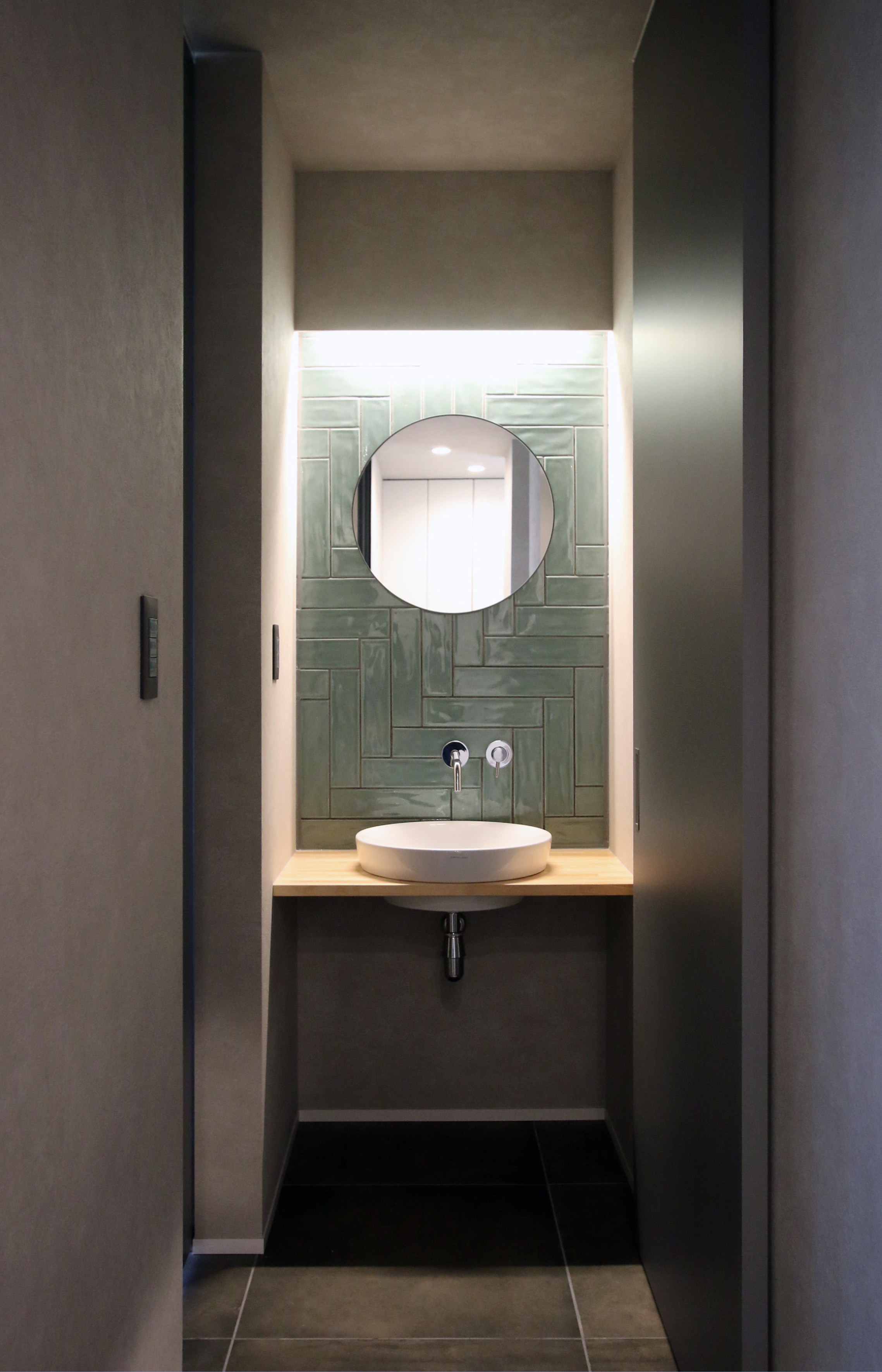 奥様よりデザインに振り切りたいとご要望を頂きました1階の手洗いは、イタリア・CATALANO製の洗面ボウルを使用し、背面にはタイル貼りの壁にこだわりの丸型鑑と間接照明をほどこしたデザインで造り上げ、素敵な物が出来ました。