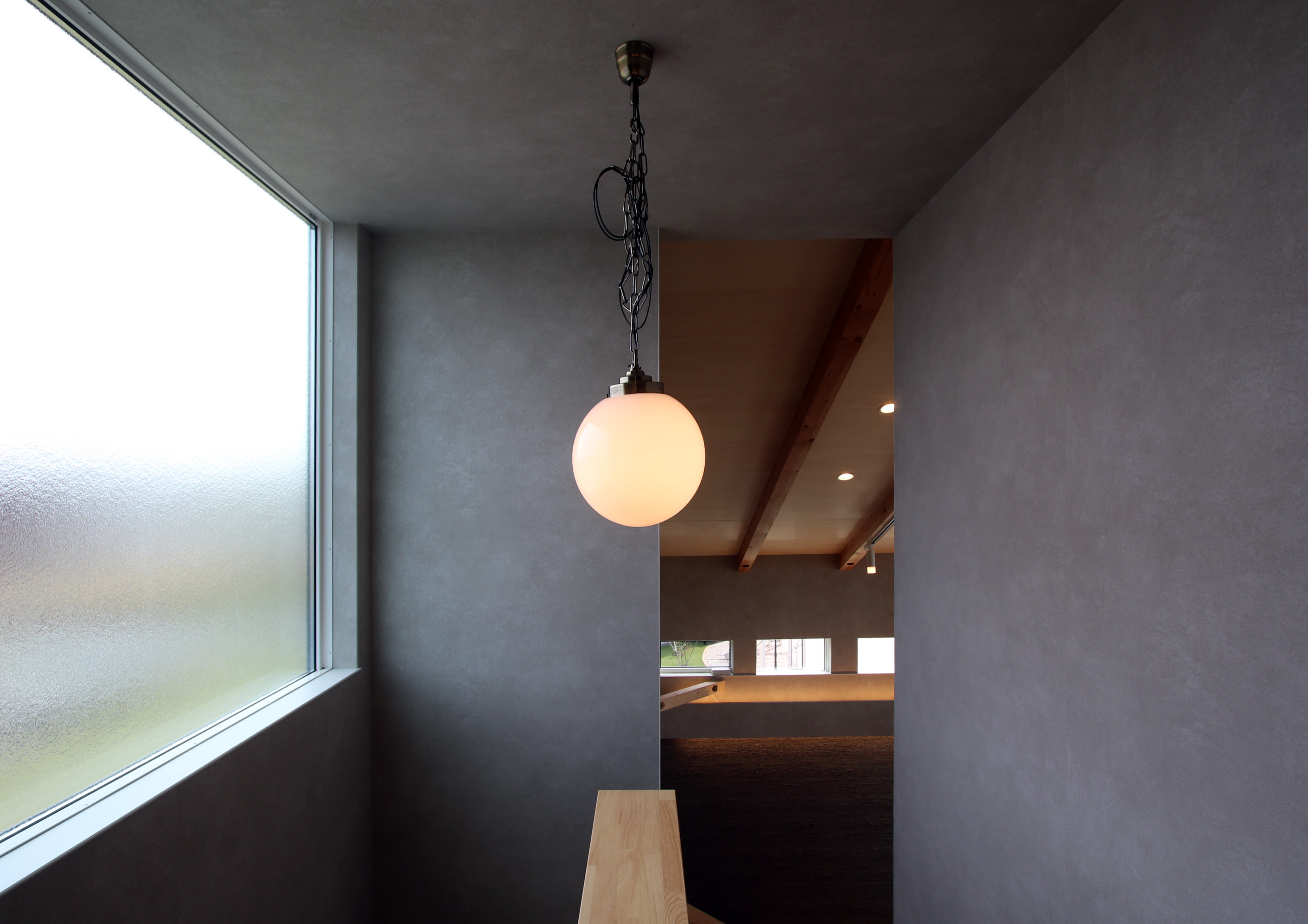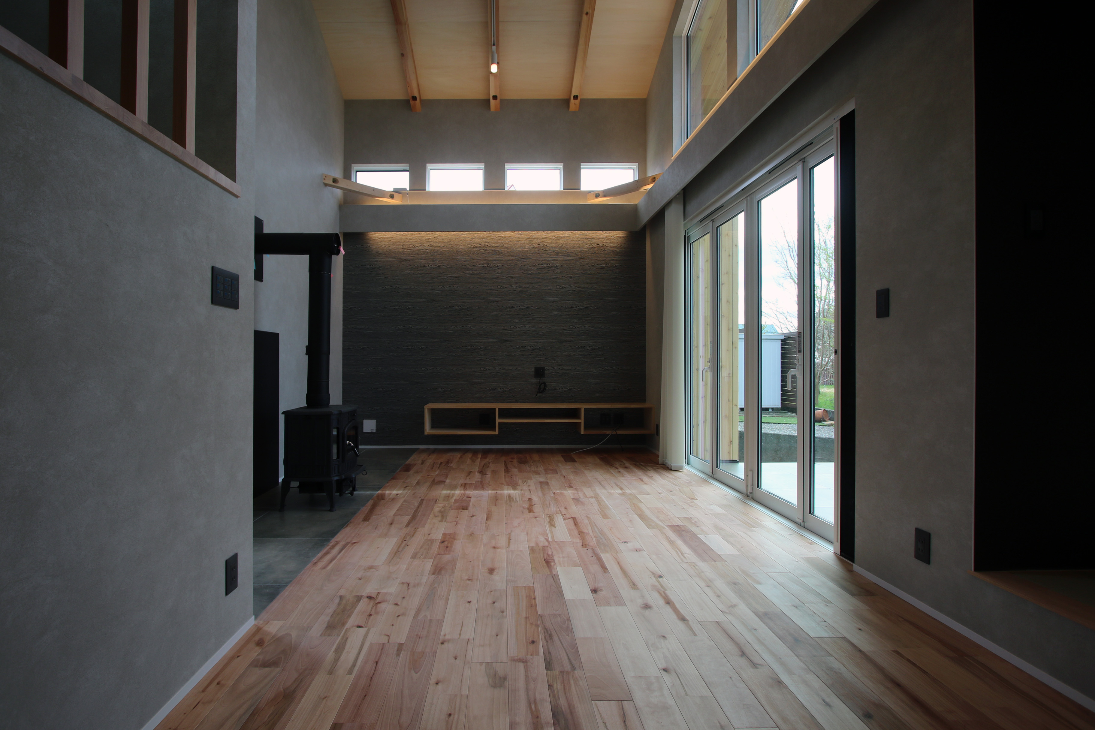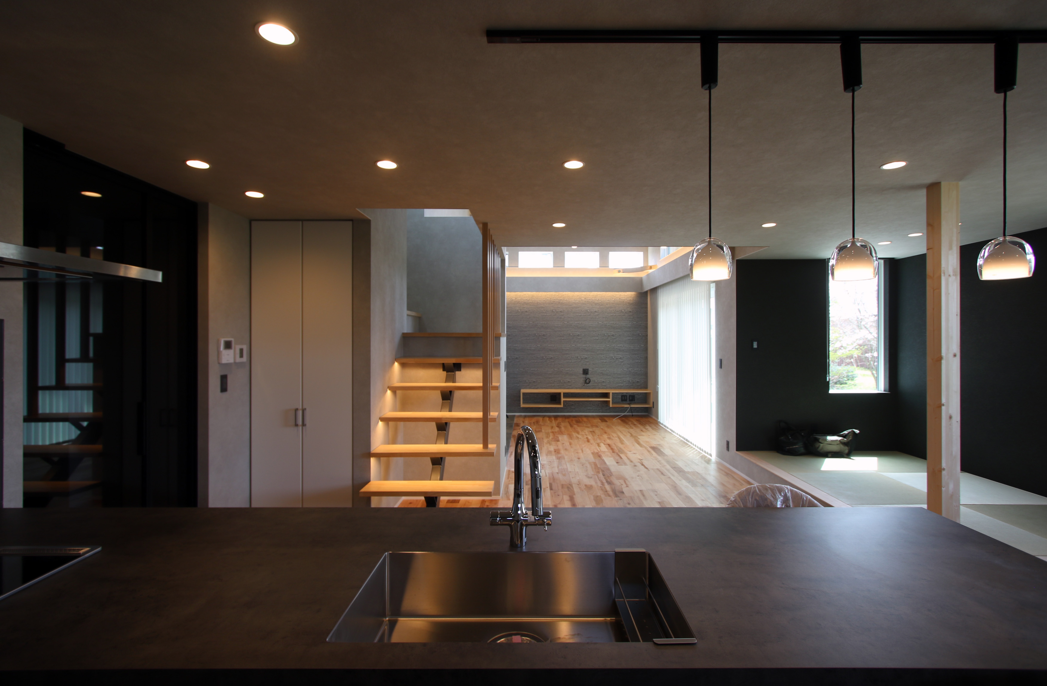 1階には土間収納と水周りの他には30帖以上の大きなLDKを設け、開放感のある勾配天井で、更に空間を広く演出いたしました。小上がりのコーナー和室が空間を柔らかにしてくれてます。