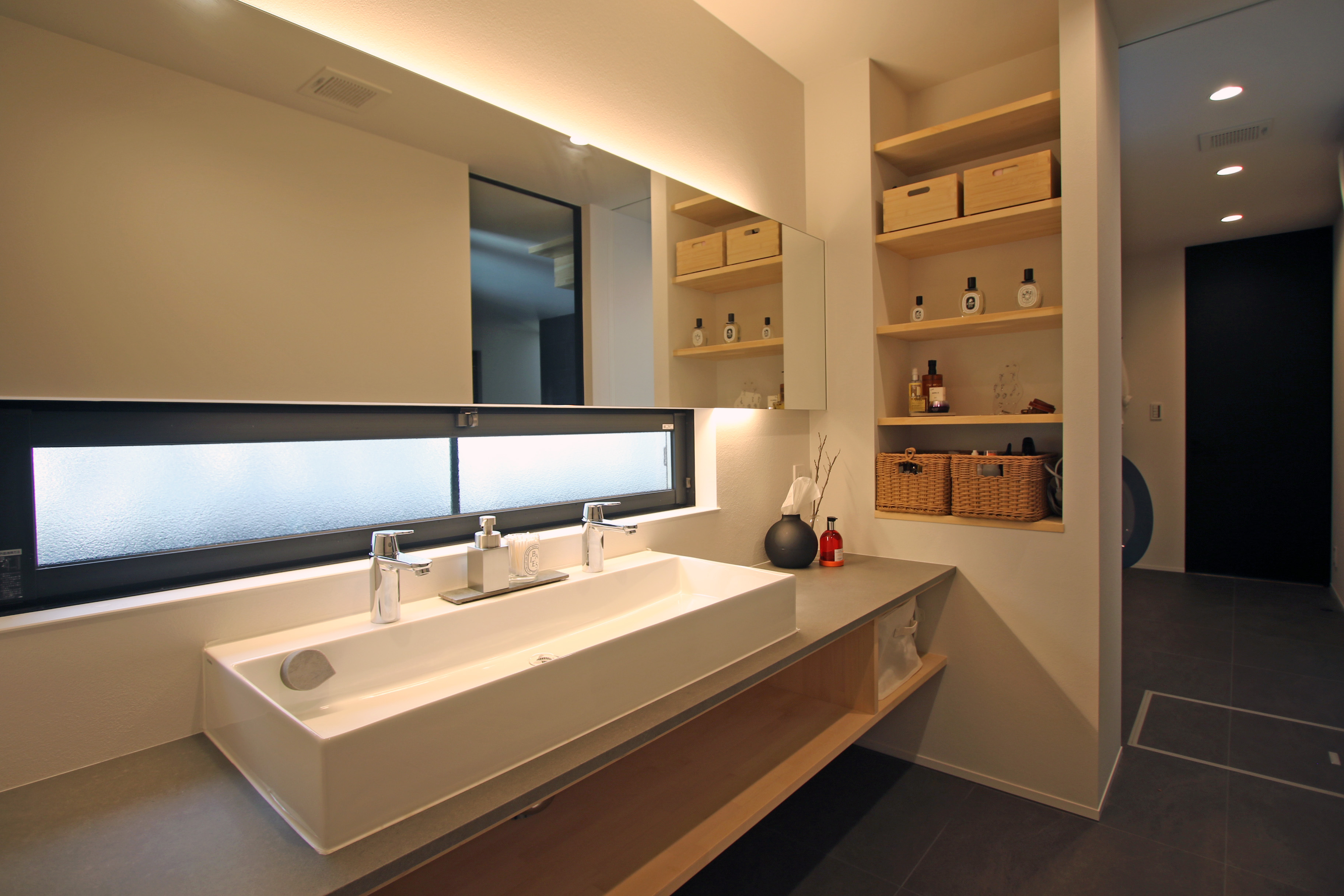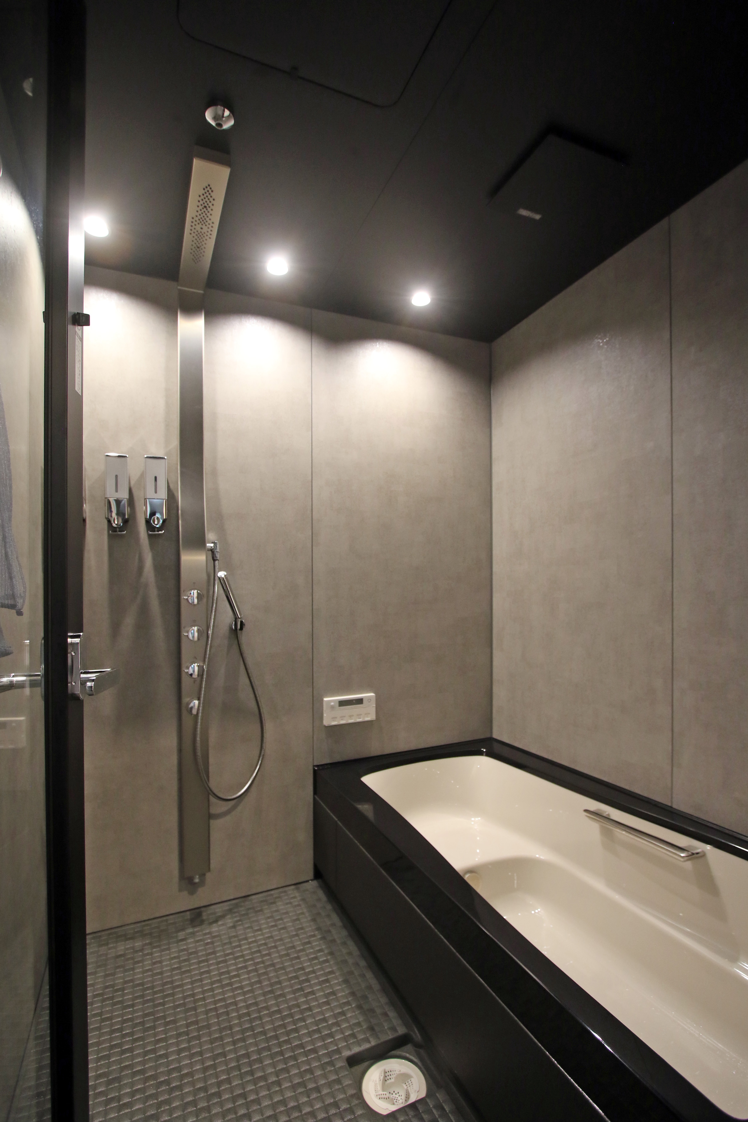 お施主様こだわりのシックな浴室が空間を引き締めてくれます。
