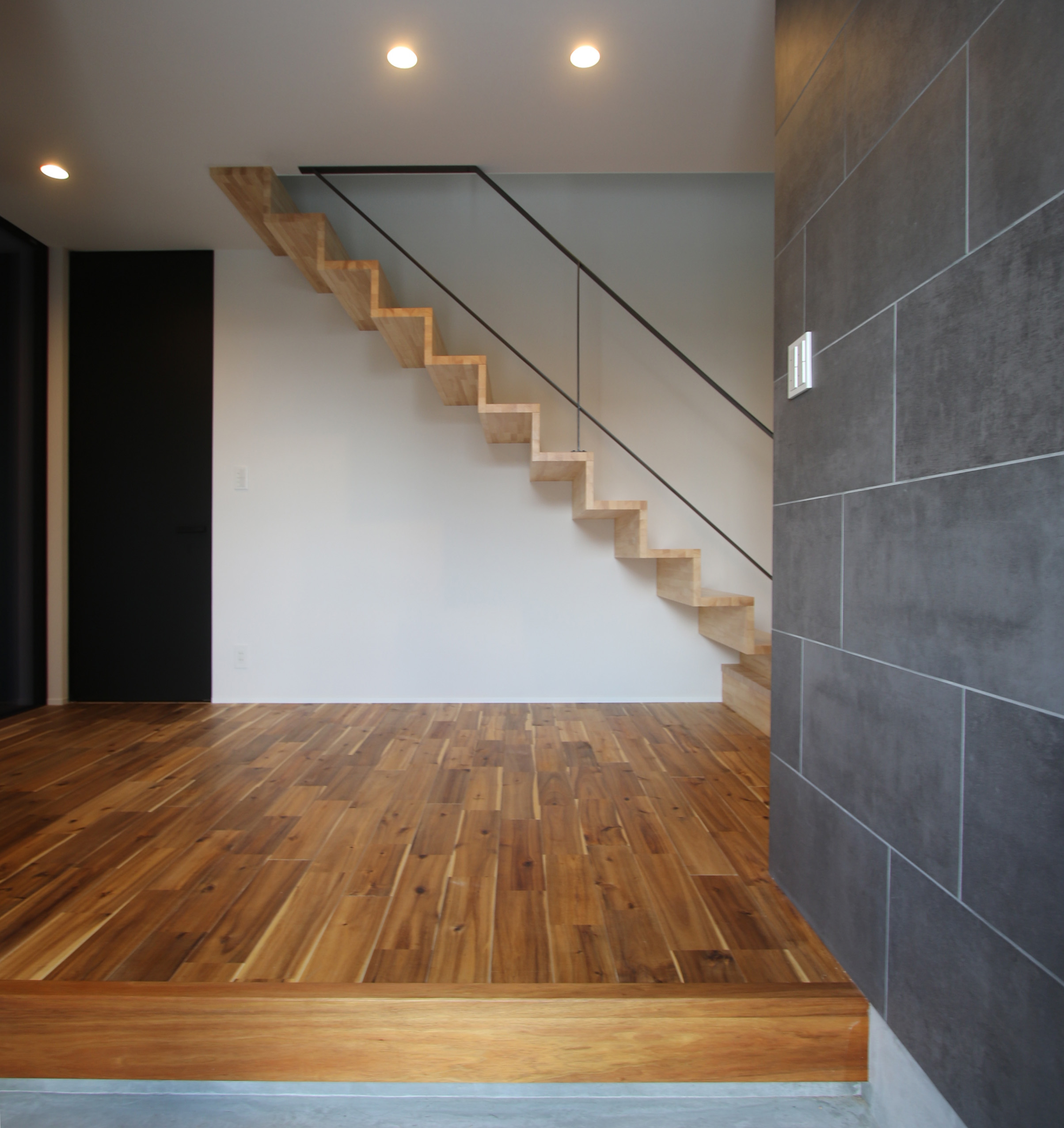 またお施主様には幼いお子様が居られるので、駐車場から家までベビーカーを押して上がれるようつづら折りスロープを設け、土留めの代わりとしての機能も果たすよう計画を立てました。