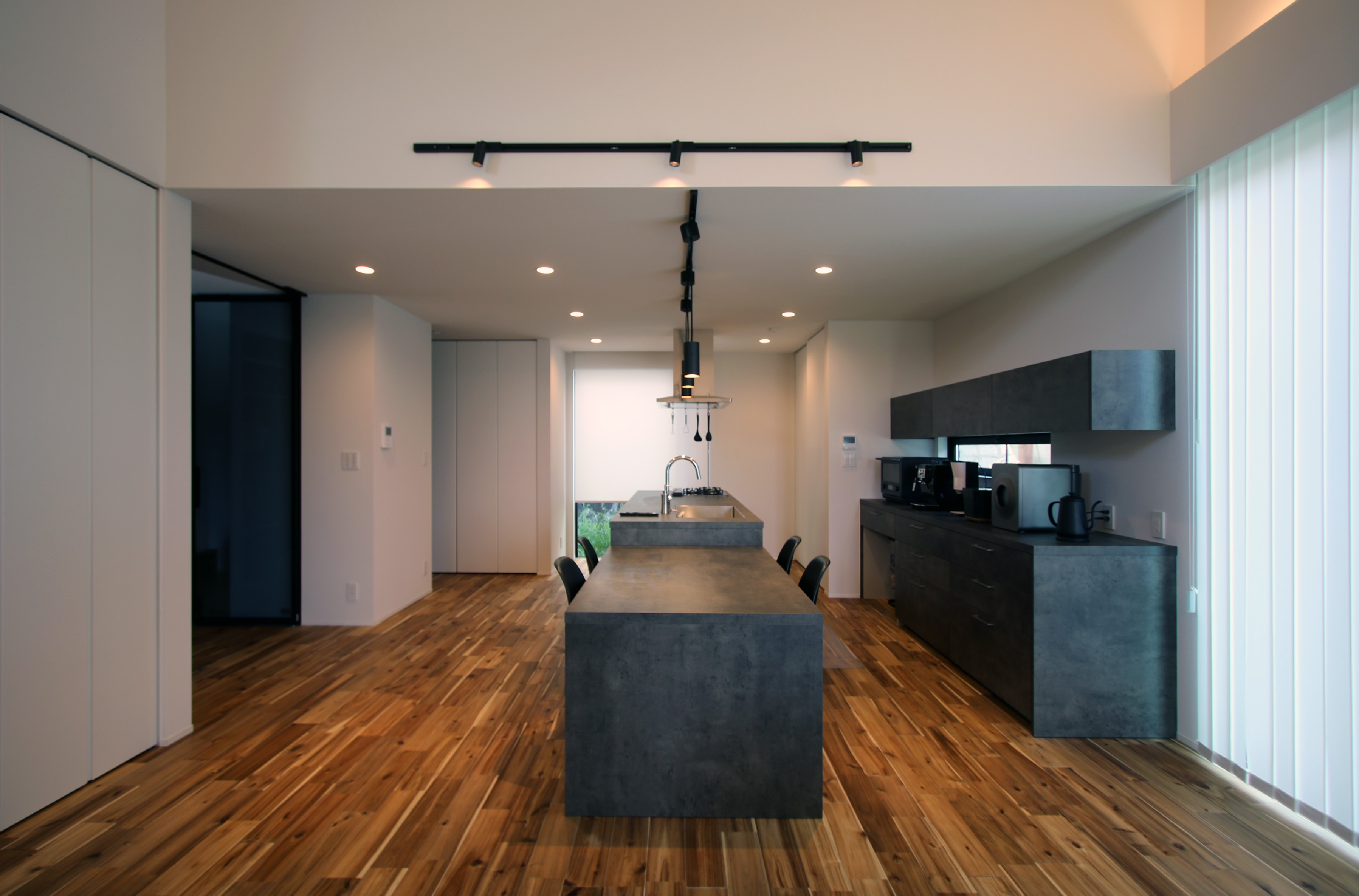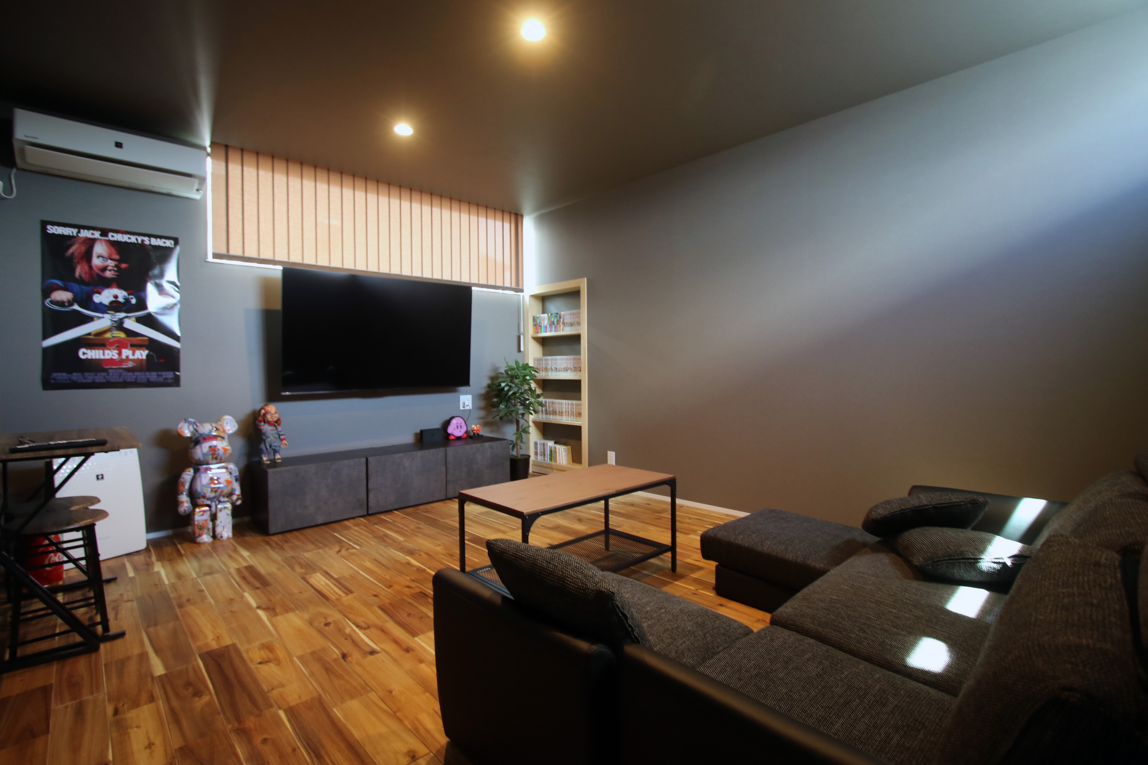 家は約50坪の大きな邸宅でLDKは30帖ほどある広い空間で、リビングの天井は3.5mの高さがある高天井にして高所に明り窓を設けて空間を広く・明るくなるよう設計。