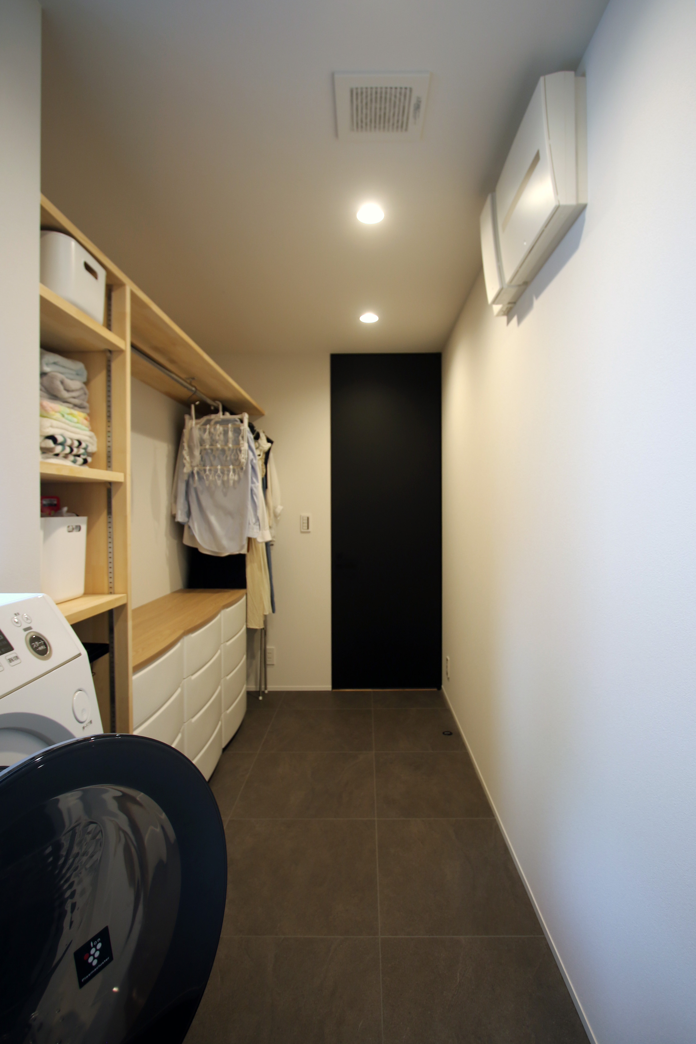 玄関を開けたホール正面には総持たせの階段と南側の中庭から光が入るように配置。3帖の洗面所と約4帖もあるランドリールームはキッチンから入れる導線を確保。