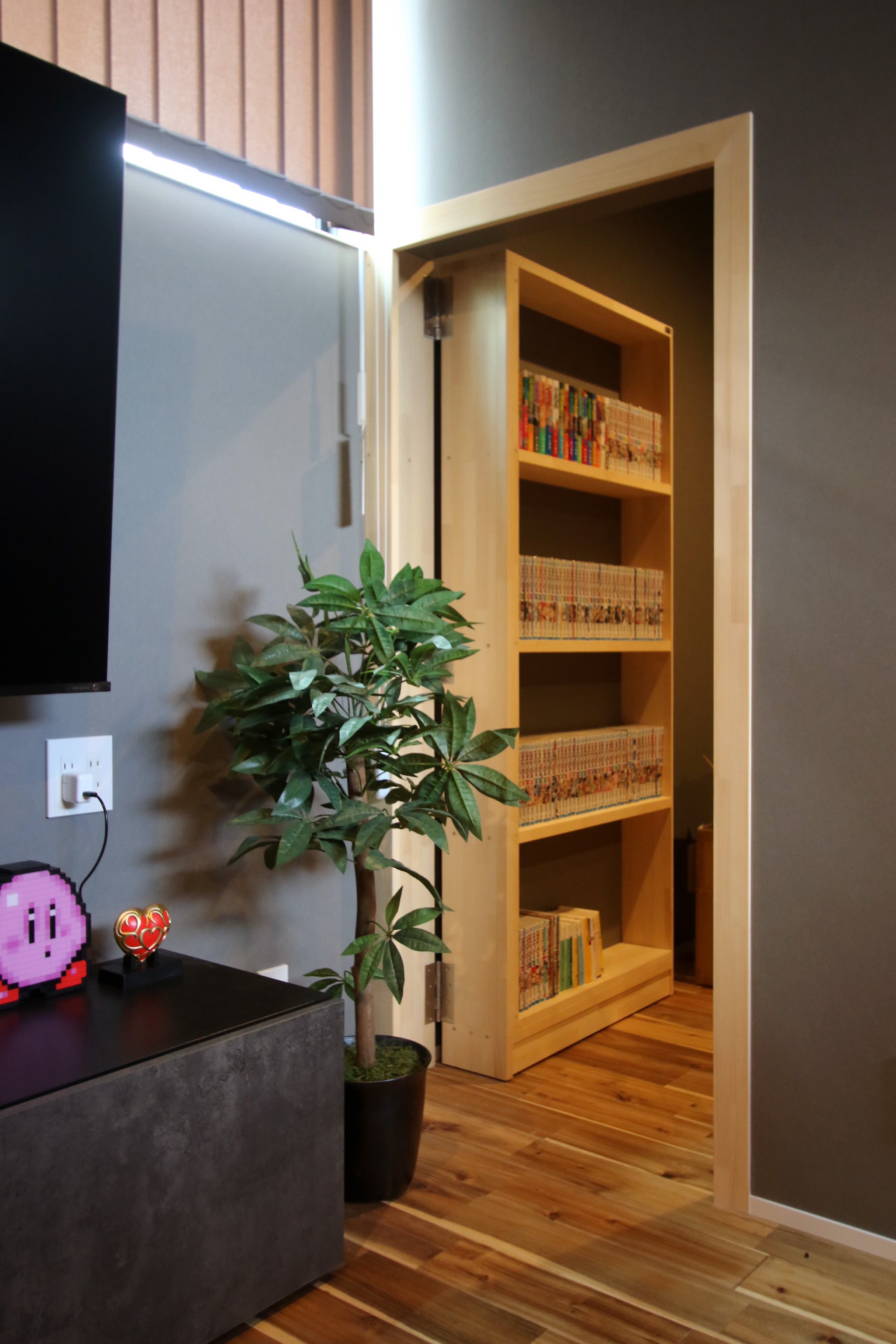 2階のご主人様の趣味室に設けた本棚が、寝室に繋がる隠し扉になっております。